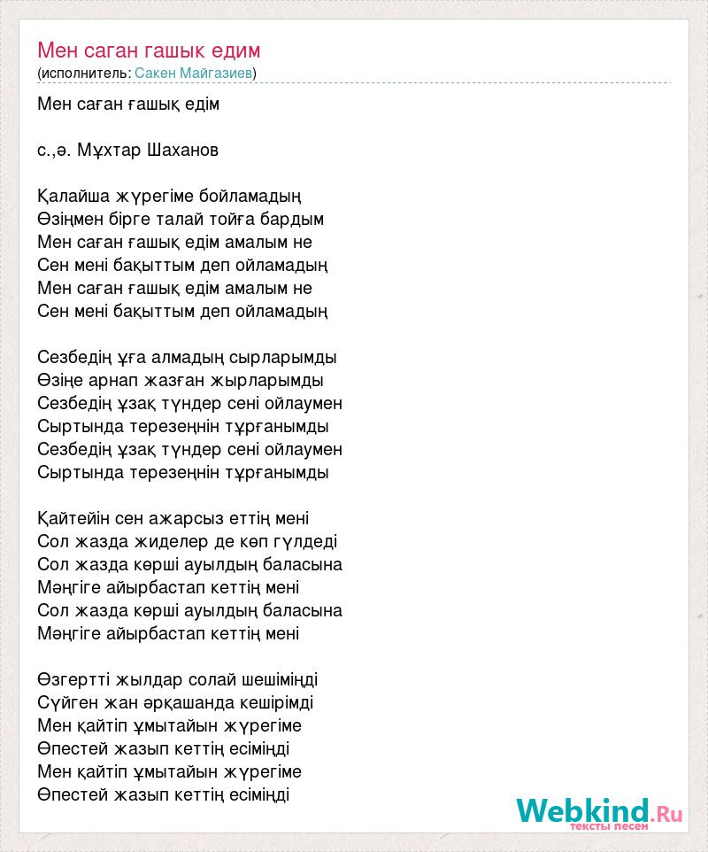 Мен саған ғашық едім с.,ә. Мұхтар Шаханов Қалайша жүрегіме бойламадың Өзіңмен бірге талай тойға бардым Мен саған ғашық едім амалым не Сен мені бақыттым деп ойламадың Мен саған ғашық едім амалым не Сен мені бақыттым деп ойламадың Сезбедің ұға алмадың сырларымды Өзіңе арнап жазған жырларымды Сезбедің ұзақ түндер сені ойлаумен Сыртында терезеңнін тұрғанымды Сезбедің ұзақ түндер сені ойлаумен Сыртында терезеңнін тұрғанымды Қайтейін сен ажарсыз еттің мені Сол жазда жиделер де көп гүлдеді Сол жазда көрші ауылдың баласына Мәңгіге айырбастап кеттің мені Сол жазда көрші ауылдың баласына Мәңгіге айырбастап кеттің мені Өзгертті жылдар солай шешіміңді Сүйген жан әрқашанда кешірімді Мен қайтіп ұмытайын жүрегіме Өпестей жазып кеттің есіміңді Мен қайтіп ұмытайын жүрегіме Өпестей жазып кеттің есіміңді