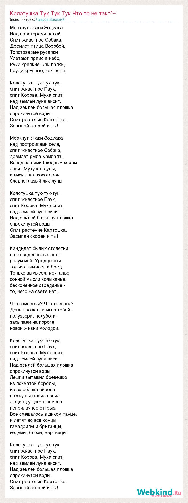 Меркнут знаки Зодиака Над просторами полей. Спит животное Собака, Дремлет птица Воробей. Толстозадые русалки Улетают прямо в небо, Руки крепкие, как палки, Груди круглые, как репа. Колотушка тук-тук-тук, спит животное Паук, спит Корова, Муха спит, над землей луна висит. Над землей большая плошка опрокинутой воды. Спит растение Картошка. Засыпай скорей и ты! Меркнут знаки Зодиака над постройками села, спит животное Собака, дремлет рыба Камбала. Вслед за ними бледным хором ловят Муху колдуны, и висит над косогором бледноглазый лик луны. Колотушка тук-тук-тук, спит животное Паук, спит Корова, Муха спит, над землей луна висит. Над землей большая плошка опрокинутой воды. Спит растение Картошка. Засыпай скорей и ты! Кандидат былых столетий, полководец юных лет - разум мой! Уродцы эти - только вымысел и бред. Только вымысел, мечтанье, сонной мысли колыханье, бесконечное страданье - то, чего на свете нет... Что сомненья? Что тревоги? День прошел, и мы с тобой - полузвери, полубоги - засыпаем на пороге новой жизни молодой. Колотушка тук-тук-тук, спит животное Паук, спит Корова, Муха спит, над землей луна висит. Над землей большая плошка опрокинутой воды. Леший вытащил бревешко из лохматой бороды, из-за облака сирена ножку выставила вниз, людоед у джентльмена неприличное отгрыз. Все смешалось в диком танце, и летят во все концы гамадрилы и британцы, ведьмы, блохи, мертвецы. Колотушка тук-тук-тук, спит животное Паук, спит Корова, Муха спит, над землей луна висит. Над землей большая плошка опрокинутой воды. Спит растение Картошка. Засыпай скорей и ты!