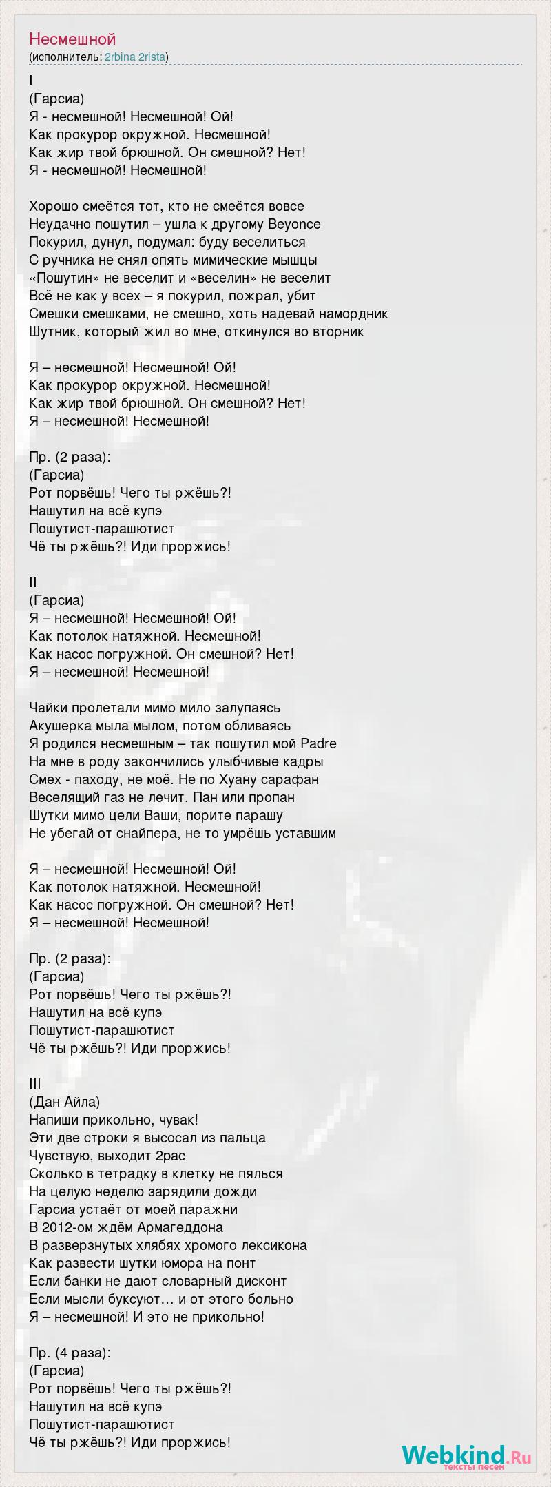 I (Гарсиа) Я - несмешной! Несмешной! Ой! Как прокурор окружной. Несмешной! Как жир твой брюшной. Он смешной? Нет! Я - несмешной! Несмешной! Хорошо смеётся тот, кто не смеётся вовсе Неудачно пошутил – ушла к другому Beyonce Покурил, дунул, подумал: буду веселиться С ручника не снял опять мимические мышцы «Пошутин» не веселит и «веселин» не веселит Всё не как у всех – я покурил, пожрал, убит Смешки смешками, не смешно, хоть надевай намордник Шутник, который жил во мне, откинулся во вторник Я – несмешной! Несмешной! Ой! Как прокурор окружной. Несмешной! Как жир твой брюшной. Он смешной? Нет! Я – несмешной! Несмешной! Пр. (2 раза): (Гарсиа) Рот порвёшь! Чего ты ржёшь?! Нашутил на всё купэ Пошутист-парашютист Чё ты ржёшь?! Иди проржись! II (Гарсиа) Я – несмешной! Несмешной! Ой! Как потолок натяжной. Несмешной! Как насос погружной. Он смешной? Нет! Я – несмешной! Несмешной! Чайки пролетали мимо мило залупаясь Акушерка мыла мылом, потом обливаясь Я родился несмешным – так пошутил мой Padre На мне в роду закончились улыбчивые кадры Смех - паходу, не моё. Не по Хуану сарафан Веселящий газ не лечит. Пан или пропан Шутки мимо цели Ваши, порите парашу Не убегай от снайпера, не то умрёшь уставшим Я – несмешной! Несмешной! Ой! Как потолок натяжной. Несмешной! Как насос погружной. Он смешной? Нет! Я – несмешной! Несмешной! Пр. (2 раза): (Гарсиа) Рот порвёшь! Чего ты ржёшь?! Нашутил на всё купэ Пошутист-парашютист Чё ты ржёшь?! Иди проржись! III (Дан Айла) Напиши прикольно, чувак! Эти две строки я высосал из пальца Чувствую, выходит 2pac Сколько в тетрадку в клетку не пялься На целую неделю зарядили дожди Гарсиа устаёт от моей паражни В 2012-ом ждём Армагеддона В разверзнутых хлябях хромого лексикона Как развести шутки юмора на понт Если банки не дают словарный дисконт Если мысли буксуют… и от этого больно Я – несмешной! И это не прикольно! Пр. (4 раза): (Гарсиа) Рот порвёшь! Чего ты ржёшь?! Нашутил на всё купэ Пошутист-парашютист Чё ты ржёшь?! Иди проржись!
