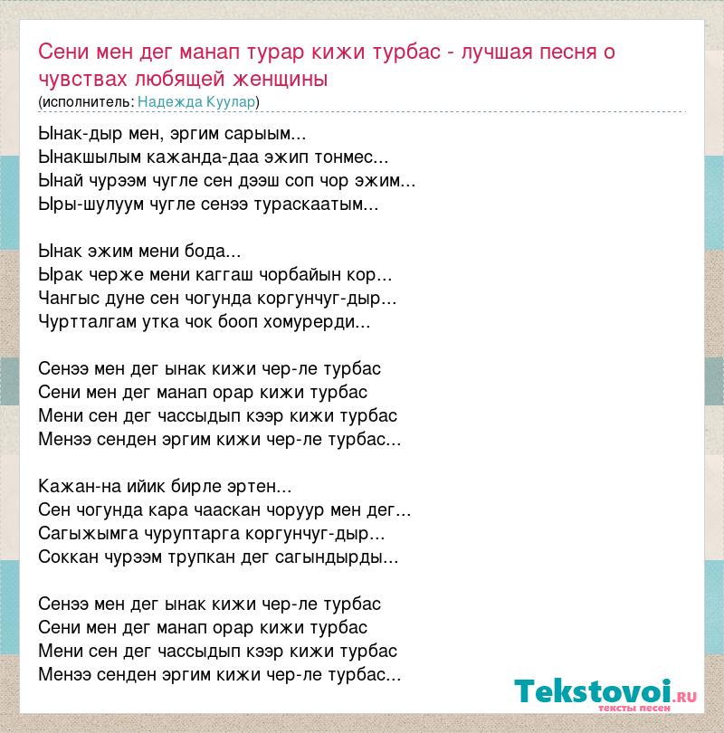 Ынак-дыр мен, эргим сарыым... Ынакшылым кажанда-даа эжип тонмес... Ынай чурээм чугле сен дээш соп чор эжим... Ыры-шулуум чугле сенээ тураскаатым... Ынак эжим мени бода... Ырак черже мени каггаш чорбайын кор... Чангыс дуне сен чогунда коргунчуг-дыр... Чуртталгам утка чок бооп хомурерди... Сенээ мен дег ынак кижи чер-ле турбас Сени мен дег манап орар кижи турбас Мени сен дег чассыдып кээр кижи турбас Менээ сенден эргим кижи чер-ле турбас... Кажан-на ийик бирле эртен... Сен чогунда кара чааскан чоруур мен дег... Сагыжымга чуруптарга коргунчуг-дыр... Соккан чурээм трупкан дег сагындырды... Сенээ мен дег ынак кижи чер-ле турбас Сени мен дег манап орар кижи турбас Мени сен дег чассыдып кээр кижи турбас Менээ сенден эргим кижи чер-ле турбас...