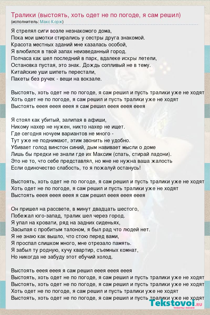 Я стрелял сиги возле незнакомого дома, Пока мои шмотки стирались у сестры друга знакомой. Красота местных зданий мне казалась особой, Я влюбился в твой запах неизведанный город. Полчаса как шел последний в парк, вдалеке искры летели, Остановка пустая, это знак. Дождь сопливый не в тему. Китайские уши шипеть перестали, Пакеты без ручек - вещи на вокзале. Выстоять, хоть одет не по погоде, я сам решил и пусть тралики уже не ходят Хоть одет не по погоде, я сам решил и пусть тралики уже не ходят Выстоять ееея ееея ееея я сам решил ееея ееея ееея Я стоял как убитый, залипая в афиши, Никому нахер не нужен, никто нахер не ищет. Где сегодня ночуем вариантов не много - Тут уже не поднимают, этим звонить не удобно. Убивает голод винстон синий, дым навивает мысли о доме Лишь бы предки не знали где их Максим (спать, стирай ладони). Это не то, что себе представлял, но мне не нужна ваша жалость Если одиночество слабость, то я пожалуй останусь! Выстоять, хоть одет не по погоде, я сам решил и пусть тралики уже не ходят Хоть одет не по погоде, я сам решил и пусть тралики уже не ходят Выстоять ееея ееея ееея я сам решил ееея ееея ееея Он пришел на рассвете, в минут двадцать шестого, Побежал юго-запад, тралик шел через город. Я упал на кровати, ряд на задних сиденьях, Засыпая с пробитым талоном, я был рад что людей нет. Я не знаю как вышло, что стою перед вами, Я проспал слишком много, мне отрезало память. Я забыл ту родную, кучу квартир, съемных комнат, Но никогда не забуду этот ебучий холод. Выстоять ееея ееея я сам решил ееея ееея ееея Выстоять, хоть одет не по погоде, я сам решил и пусть тралики уже не ходят Выстоять, хоть одет не по погоде, я сам решил и пусть тралики уже не ходят Хоть одет не по погоде, я сам решил и пусть тралики уже не ходят Выстоять, хоть одет не по погоде, я сам решил и пусть тралики уже не ходят