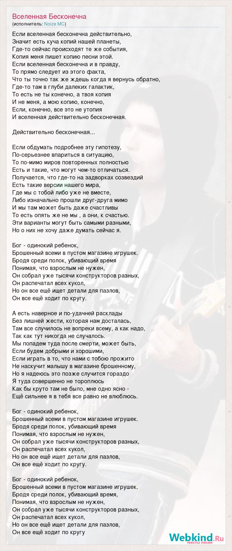 Если вселенная бесконечна действительно, Значит есть куча копий нашей планеты, Где-то сейчас происходят те же события, Копия меня пишет копию песни этой. Если вселенная бесконечна и в правду, То прямо следует из этого факта, Что ты точно так же ждешь когда я вернусь обратно, Где-то там в глуби далеких галактик, То есть не ты конечно, а твоя копия И не меня, а мою копию, конечно, Если, конечно, все это не утопия И вселенная действительно бесконечная. Действительно бесконечная... Если обдумать подробнее эту гипотезу, По-серьезнее впариться в ситуацию, То по-мимо миров повторенных полностью Есть и такие, что могут чем-то отличаться. Получается, что где-то на задворках созвездий Есть такие версии нашего мира, Где мы с тобой либо уже не вместе, Либо изначально прошли друг-друга мимо И мы там может быть даже счастливы То есть опять же не мы , а они, к счастью. Эти варианты могут быть самыми разными, Но о них не хочу даже думать сейчас я. Бог - одинокий ребенок, Брошенный всеми в пустом магазине игрушек. Бродя среди полок, убивающий время Понимая, что взрослым не нужен, Он собрал уже тысячи конструкторов разных, Он распечатал всех кукол, Но он все ещё ищет детали для пазлов, Он все ещё ходит по кругу. А есть наверное и по-удачней расклады Без лишней жести, которая нам досталась, Там все случилось не вопреки всему, а как надо, Так как тут никогда не случалось. Мы попадем туда после смерти, может быть, Если будем добрыми и хорошими, Если играть в то, что нами с тобою прожито Не наскучит малышу в магазине брошенному, Но я надеюсь это позже случится гораздо Я туда совершенно не тороплюсь Как бы круто там не было, мне одно ясно - Ещё сильнее я в тебя все равно не влюблюсь. Бог - одинокий ребенок, Брошенный всеми в пустом магазине игрушек. Бродя среди полок, убивающий время Понимая, что взрослым не нужен, Он собрал уже тысячи конструкторов разных, Он распечатал всех кукол, Но он все ещё ищет детали для пазлов, Он все ещё ходит по кругу. Бог - одинокий ребенок, Брошенный всеми в пустом магазине игрушек. Бродя среди полок, убивающий время, Понимая, что взрослым не нужен, Он собрал уже тысячи конструкторов разных, Он распечатал всех кукол, Но он все ещё ищет детали для пазлов, Он все ещё ходит по кругу
