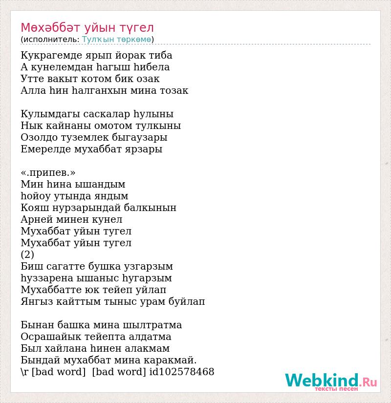 Кукрагемде ярып йорак тиба А кунелемдан hагыш hибела Утте вакыт котом бик озак Алла hин hалганхын мина тозак Кулымдагы саскалар hулыны Нык кайнаны омотом тулкыны Озолдо туземлек быгаузары Емерелде мухаббат ярзары «.припев.» Мин hина ышандым hойоу утында яндым Кояш нурзарындай балкынын Арней минен кунел Мухаббат уйын тугел Мухаббат уйын тугел (2) Биш сагатте бушка узгарзым hуззарена ышаныс hугарзым Мухаббатте юк тейеп уйлап Янгыз кайттым тыныс урам буйлап Бынан башка мина шылтратма Осрашайык тейепта алдатма Был хайлана hинен алакмам Бындай мухаббат мина каракмай. \r [bad word] [bad word] id102578468