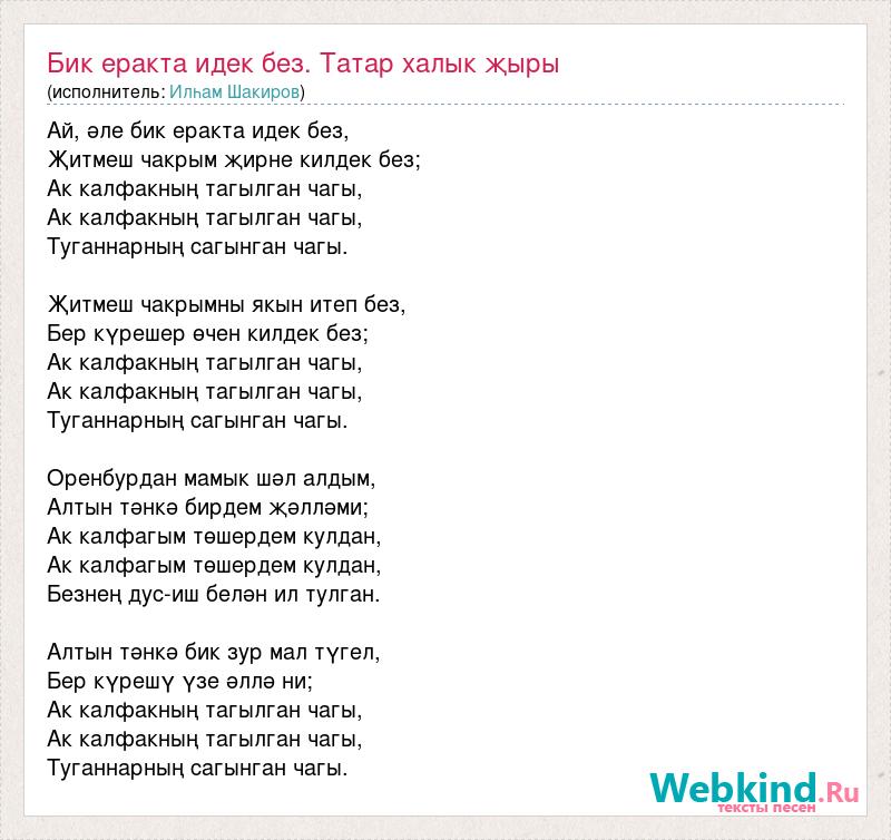 Ай, әле бик еракта идек без, Җитмеш чакрым җирне килдек без; Ак калфакның тагылган чагы, Ак калфакның тагылган чагы, Туганнарның сагынган чагы. Җитмеш чакрымны якын итеп без, Бер күрешер өчен килдек без; Ак калфакның тагылган чагы, Ак калфакның тагылган чагы, Туганнарның сагынган чагы. Оренбурдан мамык шәл алдым, Алтын тәнкә бирдем җәлләми; Ак калфагым төшердем кулдан, Ак калфагым төшердем кулдан, Безнең дус-иш белән ил тулган. Алтын тәнкә бик зур мал түгел, Бер күрешү үзе әллә ни; Ак калфакның тагылган чагы, Ак калфакның тагылган чагы, Туганнарның сагынган чагы.