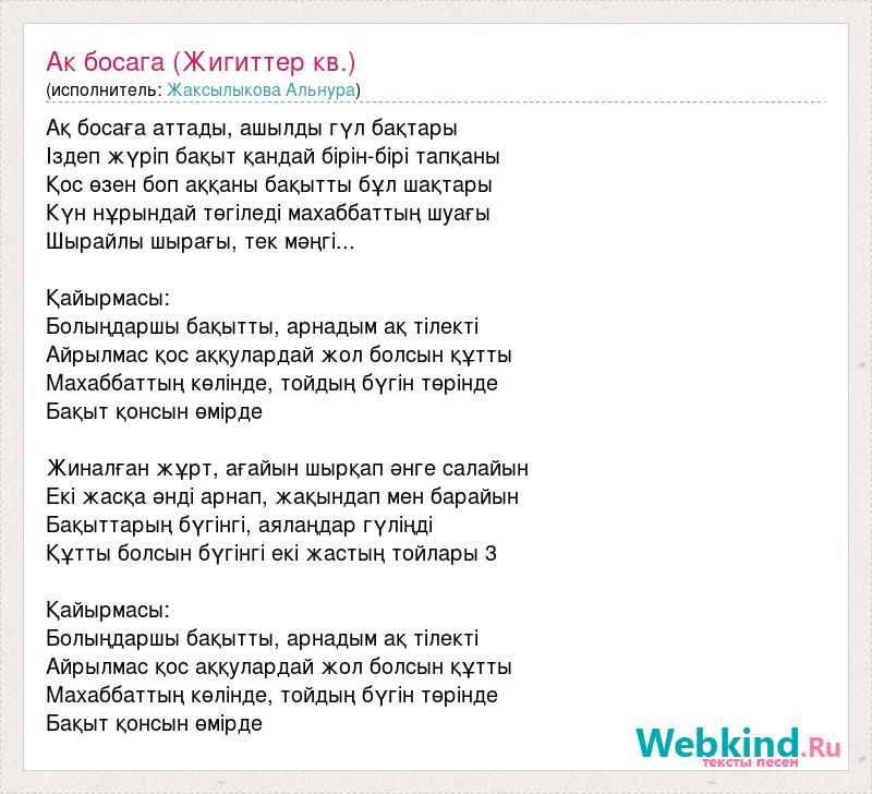 Ақ босаға аттады, ашылды гүл бақтары Іздеп жүріп бақыт қандай бірін-бірі тапқаны Қос өзен боп аққаны бақытты бұл шақтары Күн нұрындай төгіледі махаббаттың шуағы Шырайлы шырағы, тек мәңгі... Қайырмасы: Болыңдаршы бақытты, арнадым ақ тілекті Айрылмас қос аққулардай жол болсын құтты Махаббаттың көлінде, тойдың бүгін төрінде Бақыт қонсын өмірде Жиналған жұрт, ағайын шырқап әнге салайын Екі жасқа әнді арнап, жақындап мен барайын Бақыттарың бүгінгі, аялаңдар гүліңді Құтты болсын бүгінгі екі жастың тойлары 3 Қайырмасы: Болыңдаршы бақытты, арнадым ақ тілекті Айрылмас қос аққулардай жол болсын құтты Махаббаттың көлінде, тойдың бүгін төрінде Бақыт қонсын өмірде