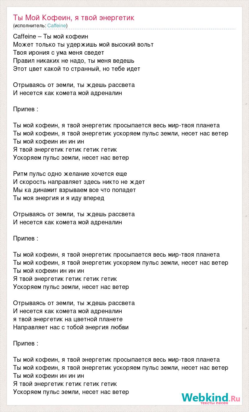 Caffeine – Ты мой кофеин Может только ты удержишь мой высокий вольт Твоя ирония с ума меня сведет Правил никаких не надо, ты меня ведешь Этот цвет какой то странный, но тебе идет Отрываясь от земли, ты ждешь рассвета И несется как комета мой адреналин Припев : Ты мой кофеин, я твой энергетик просыпается весь мир-твоя планета Ты мой кофеин, я твой энергетик ускоряем пульс земли, несет нас ветер Ты мой кофеин ин ин ин Я твой энергетик гетик гетик гетик Ускоряем пульс земли, несет нас ветер Ритм пульс одно желание хочется еще И скорость направляет здесь никто не ждет Мы ка динамит взрываем все что попадет Ты моя энергия и я иду вперед Отрываясь от земли, ты ждешь рассвета И несется как комета мой адреналин Припев : Ты мой кофеин, я твой энергетик просыпается весь мир-твоя планета Ты мой кофеин, я твой энергетик ускоряем пульс земли, несет нас ветер Ты мой кофеин ин ин ин Я твой энергетик гетик гетик гетик Ускоряем пульс земли, несет нас ветер Отрываясь от земли, ты ждешь рассвета И несется как комета мой адреналин я твой энергетик на цветной планете Направляет нас с тобой энергия любви Припев : Ты мой кофеин, я твой энергетик просыпается весь мир-твоя планета Ты мой кофеин, я твой энергетик ускоряем пульс земли, несет нас ветер Ты мой кофеин ин ин ин Я твой энергетик гетик гетик гетик Ускоряем пульс земли, несет нас ветер