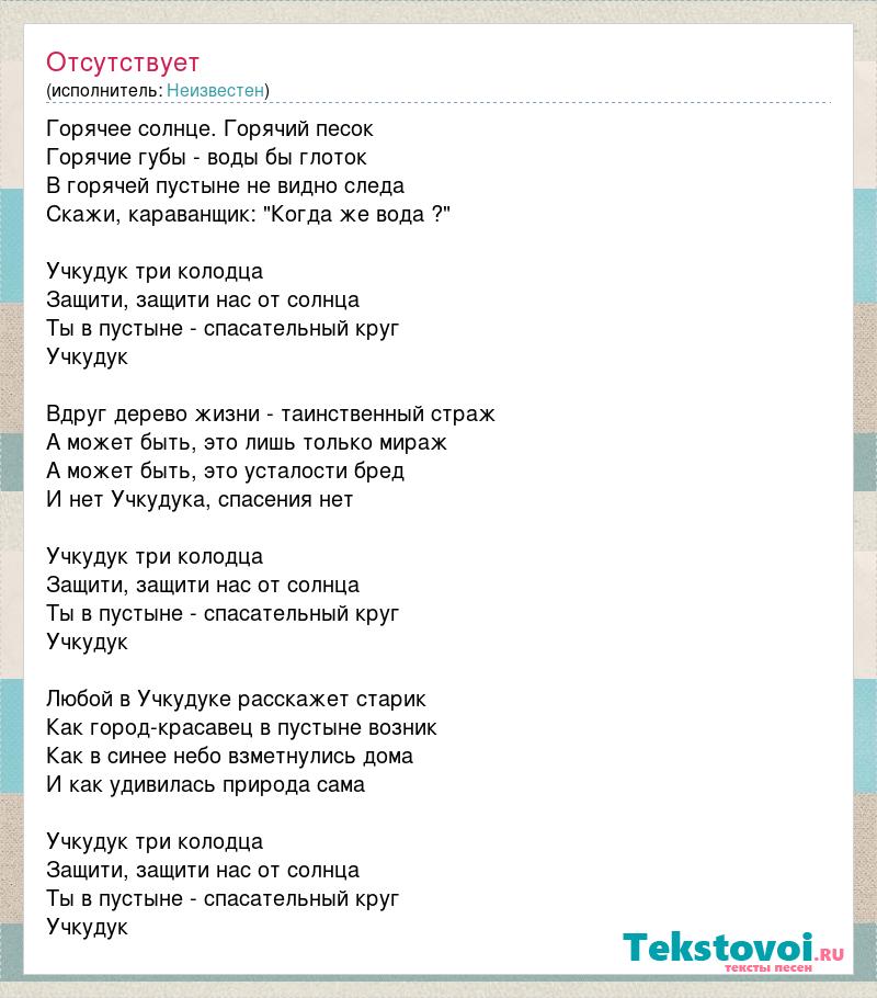 Горячее солнце. Горячий песок Горячие губы - воды бы глоток В горячей пустыне не видно следа Скажи, караванщик: "Когда же вода ?" Учкудук три колодца Защити, защити нас от солнца Ты в пустыне - спасательный круг Учкудук Вдруг дерево жизни - таинственный страж А может быть, это лишь только мираж А может быть, это усталости бред И нет Учкудука, спасения нет Учкудук три колодца Защити, защити нас от солнца Ты в пустыне - спасательный круг Учкудук Любой в Учкудуке расскажет старик Как город-красавец в пустыне возник Как в синее небо взметнулись дома И как удивилась природа сама Учкудук три колодца Защити, защити нас от солнца Ты в пустыне - спасательный круг Учкудук