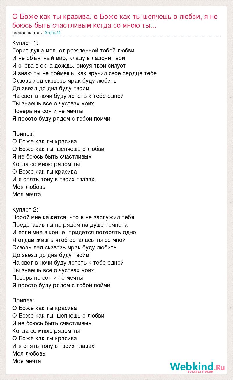 Куплет 1: Горит душа моя, от рожденной тобой любви И не объятный мир, кладу в ладони твои И снова в окна дождь, рисуя твой силуэт Я знаю ты не поймешь, как вручил свое сердце тебе Сквозь лед скзвозь мрак буду любить До звезд до дна буду твоим На свет в ночи буду лететь к тебе одной Ты знаешь все о чуствах моих Поверь не сон и не мечты Я просто буду рядом с тобой пойми Припев: О Боже как ты красива О Боже как ты шепчешь о любви Я не боюсь быть счастливым Когда со мною рядом ты О Боже как ты красива И я опять тону в твоих глазах Моя любовь Моя мечта Куплет 2: Порой мне кажется, что я не заслужил тебя Представив ты не рядом на душе темнота И если мне в конце придется потерять одно Я отдам жизнь чтоб осталась ты со мной Сквозь лед скзвозь мрак буду любить До звезд до дна буду твоим На свет в ночи буду лететь к тебе одной Ты знаешь все о чуствах моих Поверь не сон и не мечты Я просто буду рядом с тобой пойми Припев: О Боже как ты красива О Боже как ты шепчешь о любви Я не боюсь быть счастливым Когда со мною рядом ты О Боже как ты красива И я опять тону в твоих глазах Моя любовь Моя мечта