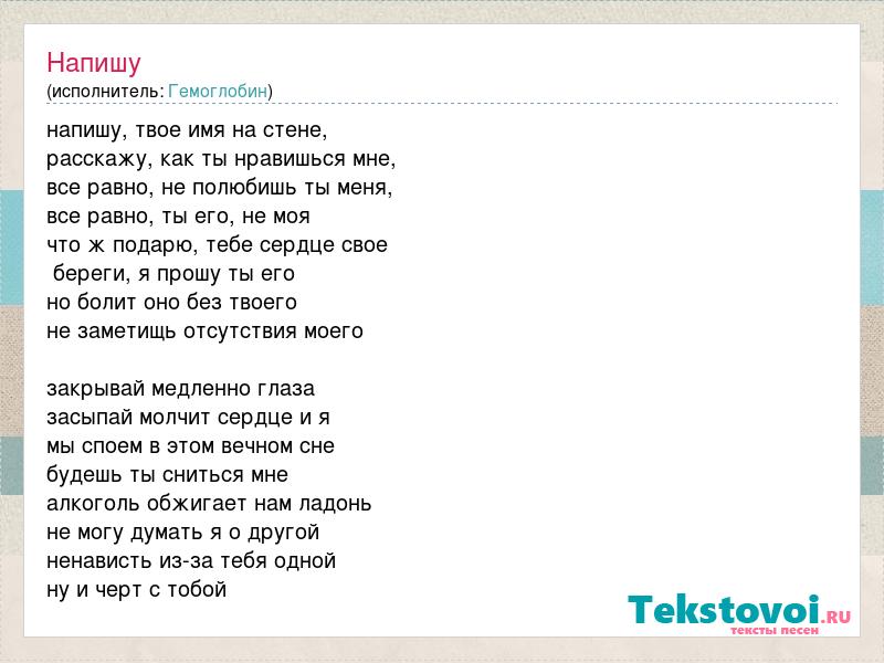 напишу, твое имя на стене, расскажу, как ты нравишься мне, все равно, не полюбишь ты меня, все равно, ты его, не моя что ж подарю, тебе сердце свое береги, я прошу ты его но болит оно без твоего не заметищь отсутствия моего закрывай медленно глаза засыпай молчит сердце и я мы споем в этом вечном сне будешь ты сниться мне алкоголь обжигает нам ладонь не могу думать я о другой ненависть из-за тебя одной ну и черт с тобой
