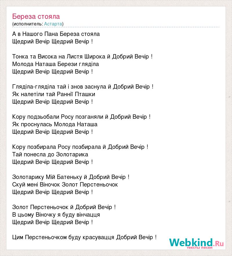 А в Нашого Пана Береза стояла Щедрий Вечір Щедрий Вечір ! Тонка та Висока на Листя Широка й Добрий Вечір ! Молода Наташа Берези гляділа Щедрий Вечір Щедрий Вечір ! Гляділа-гляділа тай і знов заснула й Добрий Вечір ! Як налетіли тай Раннії Пташки Щедрий Вечір Щедрий Вечір ! Кору подзьобали Росу позганяли й Добрий Вечір ! Як проснулась Молода Наташа Щедрий Вечір Щедрий Вечір ! Кору позбирала Росу позбирала й Добрий Вечір ! Тай понесла до Золотарика Щедрий Вечір Щедрий Вечір ! Золотарику Мій Батеньку й Добрий Вечір ! Скуй мені Віночок Золот Перстеньочок Щедрий Вечір Щедрий Вечір ! Золот Перстеньочок й Добрий Вечір ! В цьому Віночку я буду вінчацця Щедрий Вечір Щедрий Вечір ! Цим Перстеньочком буду красувацця Добрий Вечір !