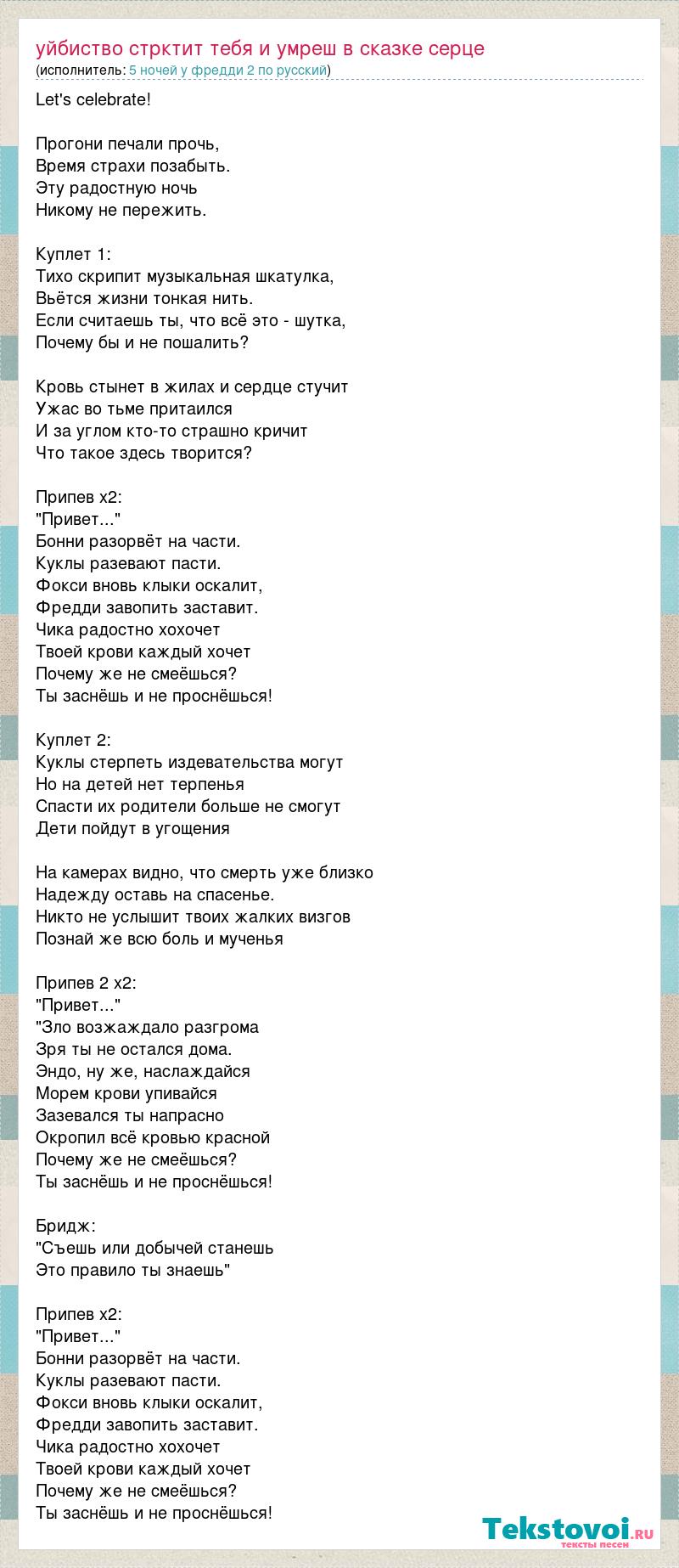 Let's celebrate! Прогони печали прочь, Время страхи позабыть. Эту радостную ночь Никому не пережить. Куплет 1: Тихо скрипит музыкальная шкатулка, Вьётся жизни тонкая нить. Если считаешь ты, что всё это - шутка, Почему бы и не пошалить? Кровь стынет в жилах и сердце стучит Ужас во тьме притаился И за углом кто-то страшно кричит Что такое здесь творится? Припев x2: "Привет..." Бонни разорвёт на части. Куклы разевают пасти. Фокси вновь клыки оскалит, Фредди завопить заставит. Чика радостно хохочет Твоей крови каждый хочет Почему же не смеёшься? Ты заснёшь и не проснёшься! Куплет 2: Куклы стерпеть издевательства могут Но на детей нет терпенья Спасти их родители больше не смогут Дети пойдут в угощения На камерах видно, что смерть уже близко Надежду оставь на спасенье. Никто не услышит твоих жалких визгов Познай же всю боль и мученья Припев 2 x2: "Привет..." "Зло возжаждало разгрома Зря ты не остался дома. Эндо, ну же, наслаждайся Морем крови упивайся Зазевался ты напрасно Окропил всё кровью красной Почему же не смеёшься? Ты заснёшь и не проснёшься! Бридж: "Съешь или добычей станешь Это правило ты знаешь" Припев x2: "Привет..." Бонни разорвёт на части. Куклы разевают пасти. Фокси вновь клыки оскалит, Фредди завопить заставит. Чика радостно хохочет Твоей крови каждый хочет Почему же не смеёшься? Ты заснёшь и не проснёшься!