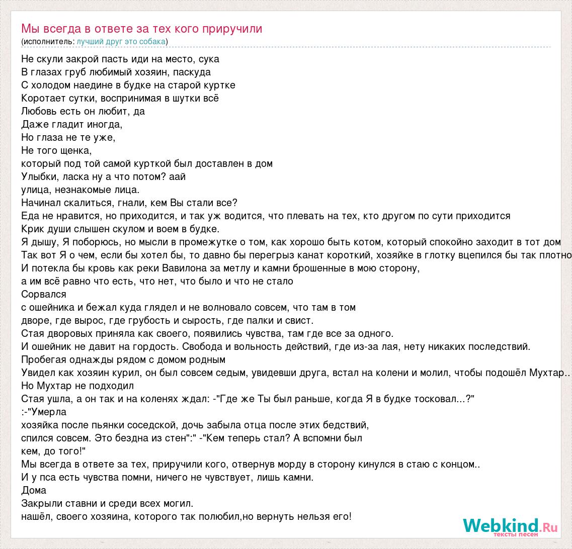 Не скули закрой пасть иди на место, сука В глазах груб любимый хозяин, паскуда С холодом наедине в будке на старой куртке Коротает сутки, воспринимая в шутки всё Любовь есть он любит, да Даже гладит иногда, Но глаза не те уже, Не того щенка, который под той самой курткой был доставлен в дом Улыбки, ласка ну а что потом? аай улица, незнакомые лица. Начинал скалиться, гнали, кем Вы стали все? Еда не нравится, но приходится, и так уж водится, что плевать на тех, кто другом по сути приходится Крик души слышен скулом и воем в будке. Я дышу, Я поборюсь, но мысли в промежутке о том, как хорошо быть котом, который спокойно заходит в тот дом Так вот Я о чем, если бы хотел бы, то давно бы перегрыз канат короткий, хозяйке в глотку вцепился бы так плотно И потекла бы кровь как реки Вавилона за метлу и камни брошенные в мою сторону, а им всё равно что есть, что нет, что было и что не стало Сорвался с ошейника и бежал куда глядел и не волновало совсем, что там в том дворе, где вырос, где грубость и сырость, где палки и свист. Стая дворовых приняла как своего, появились чувства, там где все за одного. И ошейник не давит на гордость. Свобода и вольность действий, где из-за лая, нету никаких последствий. Пробегая однажды рядом с домом родным Увидел как хозяин курил, он был совсем седым, увидевши друга, встал на колени и молил, чтобы подошёл Мухтар.. Но Мухтар не подходил Стая ушла, а он так и на коленях ждал: -"Где же Ты был раньше, когда Я в будке тосковал...?" :-"Умерла хозяйка после пьянки соседской, дочь забыла отца после этих бедствий, спился совсем. Это бездна из стен":" -"Кем теперь стал? А вспомни был кем, до того!" Мы всегда в ответе за тех, приручили кого, отвернув морду в сторону кинулся в стаю с концом.. И у пса есть чувства помни, ничего не чувствует, лишь камни. Дома Закрыли ставни и среди всех могил. нашёл, своего хозяина, которого так полюбил,но вернуть нельзя его!