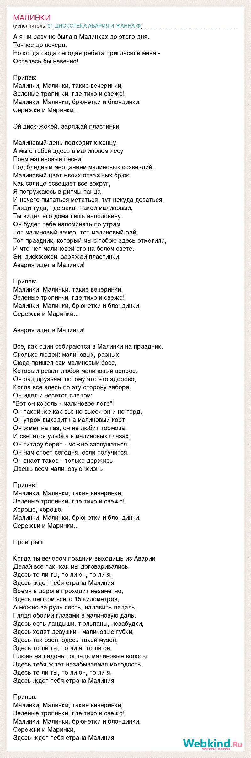 А я ни разу не была в Малинках до этого дня, Точнее до вечера. Но когда сюда сегодня ребята пригласили меня - Осталась бы навечно! Припев: Малинки, Малинки, такие вечеринки, Зеленые тропинки, где тихо и свежо! Малинки, Малинки, брюнетки и блондинки, Сережки и Маринки... Эй диск-жокей, заряжай пластинки Малиновый день подходит к концу, А мы с тобой здесь в малиновом лесу Поем малиновые песни Под бледным мерцанием малиновых созвездий. Малиновый цвет мвоих отважных брюк Как солнце освещает все вокруг, Я погружаюсь в ритмы танца И нечего пытаться метаться, тут некуда деваться. Гляди туда, где закат такой малиновый, Ты видел его дома лишь наполовину. Он будет тебе напоминать по утрам Тот малиновый вечер, тот малиновый рай, Тот праздник, который мы с тобою здесь отметили, И что нет малиновей его на белом свете. Эй, дискжокей, заряжай пластинки, Авария идет в Малинки! Припев: Малинки, Малинки, такие вечеринки, Зеленые тропинки, где тихо и свежо! Малинки, Малинки, брюнетки и блондинки, Сережки и Маринки... Авария идет в Малинки! Все, как один собираются в Малинки на праздник. Сколько людей: малиновых, разных. Сюда пришел сам малиновый босс, Который решит любой малиновый вопрос. Он рад друзьям, потому что это здорово, Когда все здесь по эту сторону забора. Он идет и несется следом: "Вот он король - малиновое лето"! Он такой же как вы: не высок он и не горд, Он утром выходит на малиновый корт, Он жмет на газ, он не любит тормоза, И светится улыбка в малиновых глазах, Он гитару берет - можно заслушаться, Он нам споет сегодня, если получится, Он знает такое - только держись. Даешь всем малиновую жизнь! Припев: Малинки, Малинки, такие вечеринки, Зеленые тропинки, где тихо и свежо! Хорошо, хорошо. Малинки, Малинки, брюнетки и блондинки, Сережки и Маринки... Проигрыш. Когда ты вечером поздним выходишь из Аварии Делай все так, как мы договаривались. Здесь то ли ты, то ли он, то ли я, Здесь ждет тебя страна Малиния. Время в дороге проходит незаметно, Здесь пешком всего 15 километров, А можно за руль сесть, надавить педаль, Глядя обоими глазами в малиновую даль. Здесь есть ландыши, тюльпаны, незабудки, Здесь ходят девушки - малиновые губки, Здесь так озон, здесь такой музон, Здесь то ли ты, то ли я, то ли он. Плюнь на ладонь погладь малиновые волосы, Здесь тебя ждет незабываемая молодость. Здесь то ли ты, то ли он, то ли я, Здесь ждет тебя страна Малиния. Припев: Малинки, Малинки, такие вечеринки, Зеленые тропинки, где тихо и свежо! Малинки, Малинки, брюнетки и блондинки, Сережки и Маринки, Здесь ждет тебя страна Малиния.