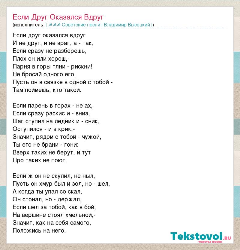Если друг оказался вдруг И не друг, и не враг, а - так, Если сразу не разберешь, Плох он или хорош,- Парня в горы тяни - рискни! Не бросай одного его, Пусть он в связке в одной с тобой - Там поймешь, кто такой. Если парень в горах - не ах, Если сразу раскис и - вниз, Шаг ступил на ледник и - сник, Оступился - и в крик,- Значит, рядом с тобой - чужой, Ты его не брани - гони: Вверх таких не берут, и тут Про таких не поют. Если ж он не скулил, не ныл, Пусть он хмур был и зол, но - шел, А когда ты упал со скал, Он стонал, но - держал, Если шел за тобой, как в бой, На вершине стоял хмельной,- Значит, как на себя самого, Положись на него.