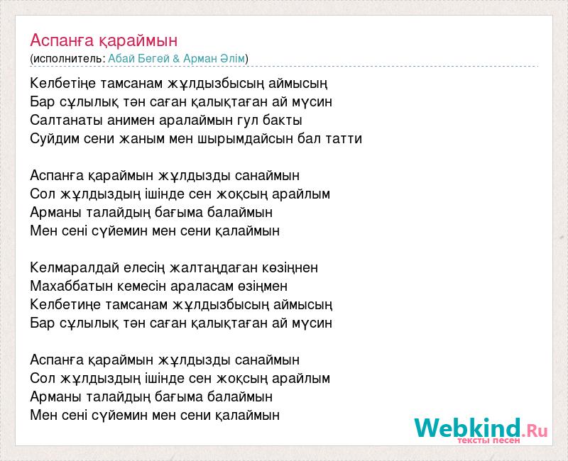Келбетіңе тамсанам жұлдызбысың аймысың Бар сұлылық тән саған қалықтаған ай мүсин Салтанаты анимен аралаймын гул бакты Суйдим сени жаным мен шырымдайсын бал татти Аспанға қараймын жұлдызды санаймын Сол жұлдыздың ішінде сен жоқсың арайлым Арманы талайдың бағыма балаймын Мен сені сүйемин мен сени қалаймын Келмаралдай елесің жалтаңдаған көзіңнен Махаббатын кемесін араласам өзіңмен Келбетиңе тамсанам жұлдызбысың аймысың Бар сұлылық тән саған қалықтаған ай мүсин Аспанға қараймын жұлдызды санаймын Сол жұлдыздың ішінде сен жоқсың арайлым Арманы талайдың бағыма балаймын Мен сені сүйемин мен сени қалаймын