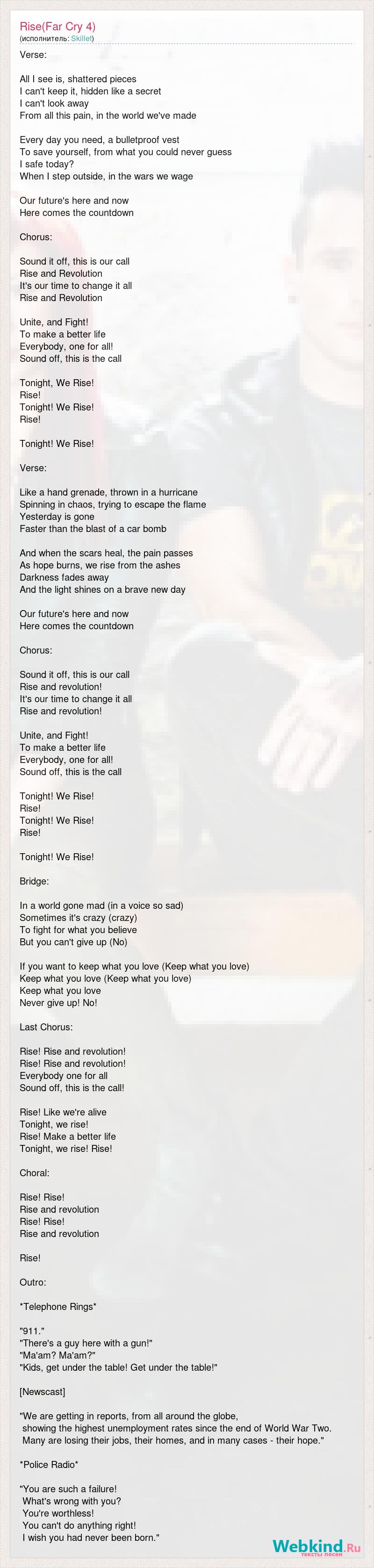 Verse: All I see is, shattered pieces I can't keep it, hidden like a secret I can't look away From all this pain, in the world we've made Every day you need, a bulletproof vest To save yourself, from what you could never guess I safe today? When I step outside, in the wars we wage Our future's here and now Here comes the countdown Chorus: Sound it off, this is our call Rise and Revolution It's our time to change it all Rise and Revolution Unite, and Fight! To make a better life Everybody, one for all! Sound off, this is the call Tonight, We Rise! Rise! Tonight! We Rise! Rise! Tonight! We Rise! Verse: Like a hand grenade, thrown in a hurricane Spinning in chaos, trying to escape the flame Yesterday is gone Faster than the blast of a car bomb And when the scars heal, the pain passes As hope burns, we rise from the ashes Darkness fades away And the light shines on a brave new day Our future's here and now Here comes the countdown Chorus: Sound it off, this is our call Rise and revolution! It's our time to change it all Rise and revolution! Unite, and Fight! To make a better life Everybody, one for all! Sound off, this is the call Tonight! We Rise! Rise! Tonight! We Rise! Rise! Tonight! We Rise! Bridge: In a world gone mad (in a voice so sad) Sometimes it's crazy (crazy) To fight for what you believe But you can't give up (No) If you want to keep what you love (Keep what you love) Keep what you love (Keep what you love) Keep what you love Never give up! No! Last Chorus: Rise! Rise and revolution! Rise! Rise and revolution! Everybody one for all Sound off, this is the call! Rise! Like we're alive Tonight, we rise! Rise! Make a better life Tonight, we rise! Rise! Choral: Rise! Rise! Rise and revolution Rise! Rise! Rise and revolution Rise! Outro: *Telephone Rings* "911." "There's a guy here with a gun!" "Ma'am? Ma'am?" "Kids, get under the table! Get under the table!" [Newscast] "We are getting in reports, from all around the globe, showing the highest unemployment rates since the end of World War Two. Many are losing their jobs, their homes, and in many cases - their hope." *Police Radio* "You are such a failure! What's wrong with you? You're worthless! You can't do anything right! I wish you had never been born."