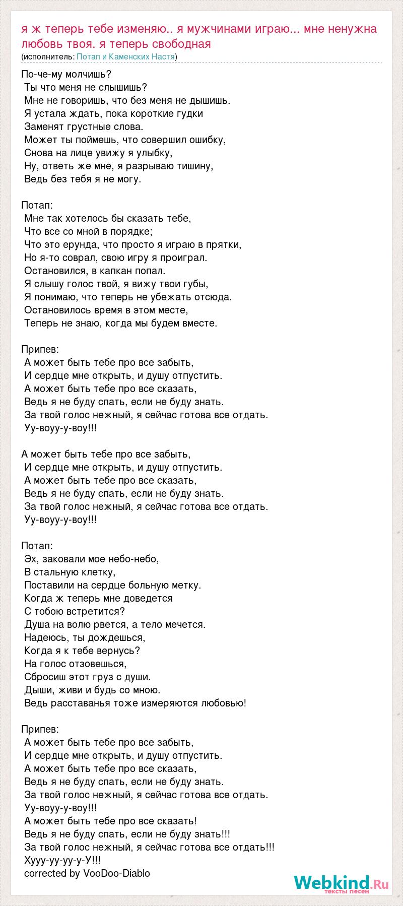 По-че-му молчишь? Ты что меня не слышишь? Мне не говоришь, что без меня не дышишь. Я устала ждать, пока короткие гудки Заменят грустные слова. Может ты поймешь, что совершил ошибку, Снова на лице увижу я улыбку, Ну, ответь же мне, я разрываю тишину, Ведь без тебя я не могу. Потап: Мне так хотелось бы сказать тебе, Что все со мной в порядке; Что это ерунда, что просто я играю в прятки, Но я-то соврал, свою игру я проиграл. Остановился, в капкан попал. Я слышу голос твой, я вижу твои губы, Я понимаю, что теперь не убежать отсюда. Остановилось время в этом месте, Теперь не знаю, когда мы будем вместе. Припев: А может быть тебе про все забыть, И сердце мне открыть, и душу отпустить. А может быть тебе про все сказать, Ведь я не буду спать, если не буду знать. За твой голос нежный, я сейчас готова все отдать. Уу-воуу-у-воу!!! А может быть тебе про все забыть, И сердце мне открыть, и душу отпустить. А может быть тебе про все сказать, Ведь я не буду спать, если не буду знать. За твой голос нежный, я сейчас готова все отдать. Уу-воуу-у-воу!!! Потап: Эх, заковали мое небо-небо, В стальную клетку, Поставили на сердце больную метку. Когда ж теперь мне доведется С тобою встретится? Душа на волю рвется, а тело мечется. Надеюсь, ты дождешься, Когда я к тебе вернусь? На голос отзовешься, Сбросиш этот груз с души. Дыши, живи и будь со мною. Ведь расставанья тоже измеряются любовью! Припев: А может быть тебе про все забыть, И сердце мне открыть, и душу отпустить. А может быть тебе про все сказать, Ведь я не буду спать, если не буду знать. За твой голос нежный, я сейчас готова все отдать. Уу-воуу-у-воу!!! А может быть тебе про все сказать! Ведь я не буду спать, если не буду знать!!! За твой голос нежный, я сейчас готова все отдать!!! Хууу-уу-уу-у-У!!! corrected by VooDoo-Diablo