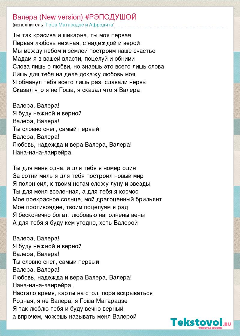 Ты так красива и шикарна, ты моя первая Первая любовь нежная, с надеждой и верой Мы между небом и землей построим наше счастье Мадам я в вашей власти, поцелуй и обними Слова лишь о любви, но знаешь это всего лишь слова Лишь для тебя на деле докажу любовь моя Я обманул тебя всего лишь раз, сдавали нервы Сказал что я не Гоша, я сказал что я Валера Валера, Валера! Я буду нежной и верной Валера, Валера! Ты словно снег, самый первый Валера, Валера! Любовь, надежда и вера Валера, Валера! Нана-нана-лаирейра. Ты для меня одна, и для тебя я номер один За сотни миль я для тебя построил новый мир Я полон сил, к твоим ногам сложу луну и звезды Ты для меня вселенная, а для тебя я космос Мое прекрасное солнце, мой драгоценный брильянт Мое противоядие, твоим поцелуям я рад Я бесконечно богат, любовью наполнены вены А для тебя я буду кем угодно, хоть Валерой Валера, Валера! Я буду нежной и верной Валера, Валера! Ты словно снег, самый первый Валера, Валера! Любовь, надежда и вера Валера, Валера! Нана-нана-лаирейра. Настало время, карты на стол, пора вскрываться Родная, я не Валера, я Гоша Матарадзе Я так люблю тебя и буду вечно верный а впрочем, можешь называть меня Валерой