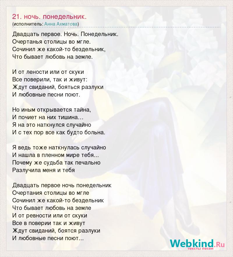 Двадцать первое. Ночь. Понедельник. Очертанья столицы во мгле. Сочинил же какой-то бездельник, Что бывает любовь на земле. И от лености или от скуки Все поверили, так и живут: Ждут свиданий, бояться разлуки И любовные песни поют. Но иным открывается тайна, И почиет на них тишина… Я на это наткнулся случайно И с тех пор все как будто больна. Я ведь тоже наткнулась случайно И нашла в пленном мире тебя... Почему же судьба так печально Разлучила меня и тебя Двадцать первое ночь понедельник Очертания столицы во мгле Сочинил же какой-то бездельник Что бывает любовь на земле И от ревности или от скуки Все в поверии так и живут Ждут свиданий, боятся разлуки И любовные песни поют...
