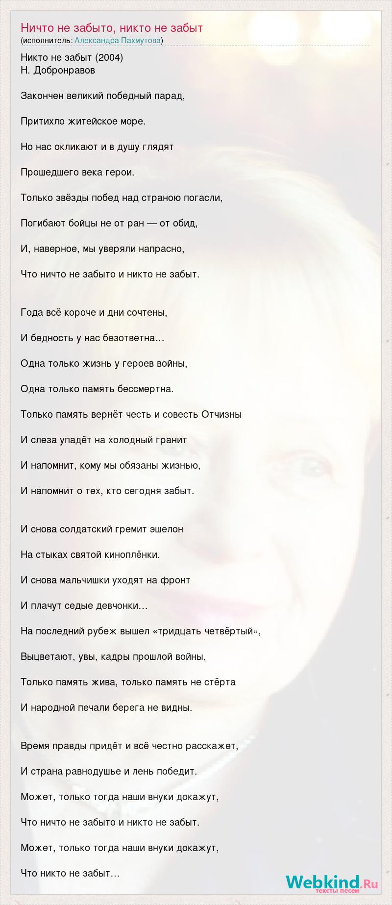 Никто не забыт (2004) Н. Добронравов Закончен великий победный парад, Притихло житейское море. Но нас окликают и в душу глядят Прошедшего века герои. Только звёзды побед над страною погасли, Погибают бойцы не от ран — от обид, И, наверное, мы уверяли напрасно, Что ничто не забыто и никто не забыт. Года всё короче и дни сочтены, И бедность у нас безответна… Одна только жизнь у героев войны, Одна только память бессмертна. Только память вернёт честь и совесть Отчизны И слеза упадёт на холодный гранит И напомнит, кому мы обязаны жизнью, И напомнит о тех, кто сегодня забыт. И снова солдатский гремит эшелон На стыках святой киноплёнки. И снова мальчишки уходят на фронт И плачут седые девчонки… На последний рубеж вышел «тридцать четвёртый», Выцветают, увы, кадры прошлой войны, Только память жива, только память не стёрта И народной печали берега не видны. Время правды придёт и всё честно расскажет, И страна равнодушье и лень победит. Может, только тогда наши внуки докажут, Что ничто не забыто и никто не забыт. Может, только тогда наши внуки докажут, Что никто не забыт…