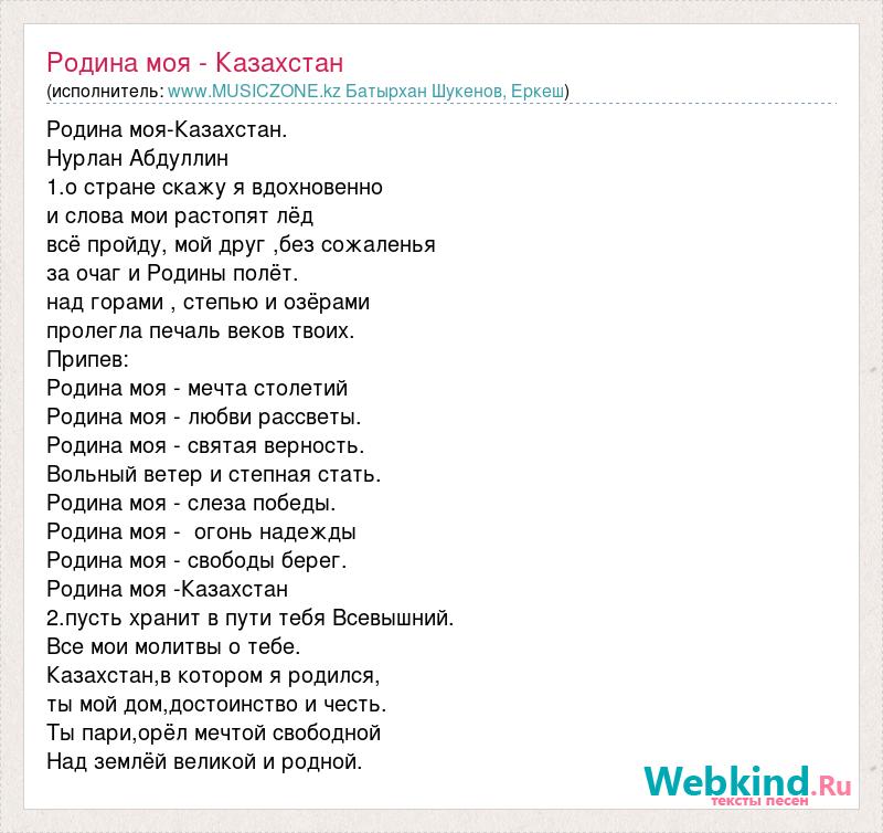 Родина моя-Казахстан. Нурлан Абдуллин 1.о стране скажу я вдохновенно и слова мои растопят лёд всё пройду, мой друг ,без сожаленья за очаг и Родины полёт. над горами , степью и озёрами пролегла печаль веков твоих. Припев: Родина моя - мечта столетий Родина моя - любви рассветы. Родина моя - святая верность. Вольный ветер и степная стать. Родина моя - слеза победы. Родина моя - огонь надежды Родина моя - свободы берег. Родина моя -Казахстан 2.пусть хранит в пути тебя Всевышний. Все мои молитвы о тебе. Казахстан,в котором я родился, ты мой дом,достоинство и честь. Ты пари,орёл мечтой свободной Над землёй великой и родной.