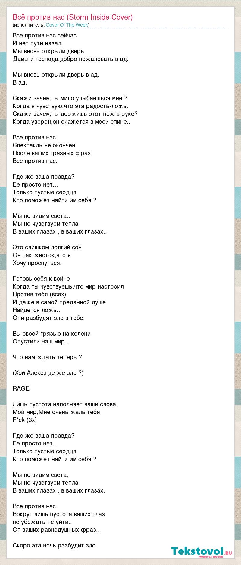 Все против нас сейчас И нет пути назад Мы вновь открыли дверь Дамы и господа,добро пожаловать в ад. Мы вновь открыли дверь в ад. В ад. Скажи зачем,ты мило улыбаешься мне ? Когда я чувствую,что эта радость-ложь. Скажи зачем,ты держишь этот нож в руке? Когда уверен,он окажется в моей спине.. Все против нас Спектакль не окончен После ваших грязных фраз Все против нас. Где же ваша правда? Ее просто нет... Только пустые сердца Кто поможет найти им себя ? Мы не видим света.. Мы не чувствуем тепла В ваших глазах , в ваших глазах.. Это слишком долгий сон Он так жесток,что я Хочу проснуться. Готовь себя к войне Когда ты чувствуешь,что мир настроил Против тебя (всех) И даже в самой преданной душе Найдется ложь.. Они разбудят зло в тебе. Вы своей грязью на колени Опустили наш мир.. Что нам ждать теперь ? (Хэй Алекс,где же зло ?) RAGE Лишь пустота наполняет ваши слова. Мой мир,Мне очень жаль тебя F*ck (3x) Где же ваша правда? Ее просто нет... Только пустые сердца Кто поможет найти им себя ? Мы не видим света, Мы не чувствуем тепла В ваших глазах , в ваших глазах. Все против нас Вокруг лишь пустота ваших глаз не убежать не уйти.. От ваших равнодушных фраз.. Скоро эта ночь разбудит зло.