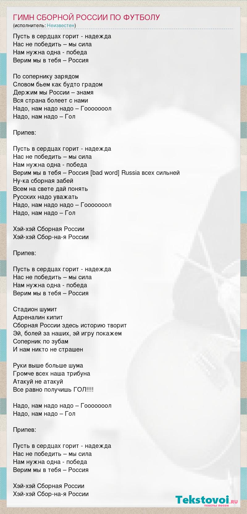 Пусть в сердцах горит - надежда Нас не победить – мы сила Нам нужна одна - победа Верим мы в тебя – Россия По сопернику зарядом Словом бьем как будто градом Держим мы России – знамя Вся страна болеет с нами Надо, нам надо надо – Гооооооол Надо, нам надо – Гол Припев: Пусть в сердцах горит - надежда Нас не победить – мы сила Нам нужна одна - победа Верим мы в тебя – Россия Russia Russia всех сильней Ну-ка сборная забей Всем на свете дай понять Русских надо уважать Надо, нам надо надо – Гооооооол Надо, нам надо – Гол Хэй-хэй Сборная России Хэй-хэй Сбор-на-я России Припев: Пусть в сердцах горит - надежда Нас не победить – мы сила Нам нужна одна - победа Верим мы в тебя – Россия Стадион шумит Адреналин кипит Сборная России здесь историю творит Эй, болей за наших, эй игру покажем Соперник по зубам И нам никто не страшен Руки выше больше шума Громче всех наша трибуна Атакуй не атакуй Все равно получишь ГОЛ!!!! Надо, нам надо надо – Гооооооол Надо, нам надо – Гол Припев: Пусть в сердцах горит - надежда Нас не победить – мы сила Нам нужна одна - победа Верим мы в тебя – Россия Хэй-хэй Сборная России Хэй-хэй Сбор-на-я России
