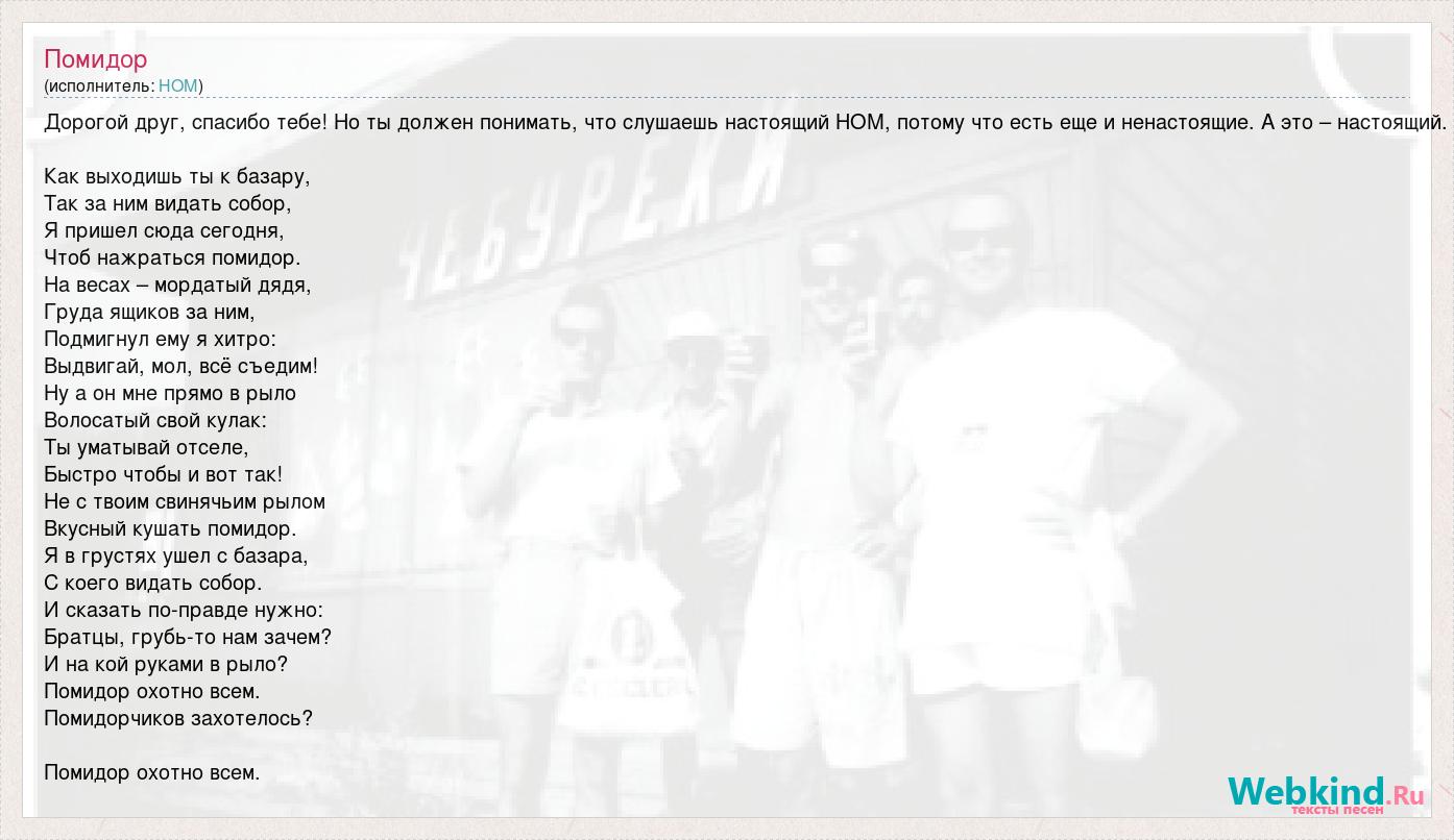 Дорогой друг, спасибо тебе! Но ты должен понимать, что слушаешь настоящий НОМ, потому что есть еще и ненастоящие. А это – настоящий. Как выходишь ты к базару, Так за ним видать собор, Я пришел сюда сегодня, Чтоб нажраться помидор. На весах – мордатый дядя, Груда ящиков за ним, Подмигнул ему я хитро: Выдвигай, мол, всё съедим! Ну а он мне прямо в рыло Волосатый свой кулак: Ты уматывай отселе, Быстро чтобы и вот так! Не с твоим свинячьим рылом Вкусный кушать помидор. Я в грустях ушел с базара, С коего видать собор. И сказать по-правде нужно: Братцы, грубь-то нам зачем? И на кой руками в рыло? Помидор охотно всем. Помидорчиков захотелось? Помидор охотно всем.