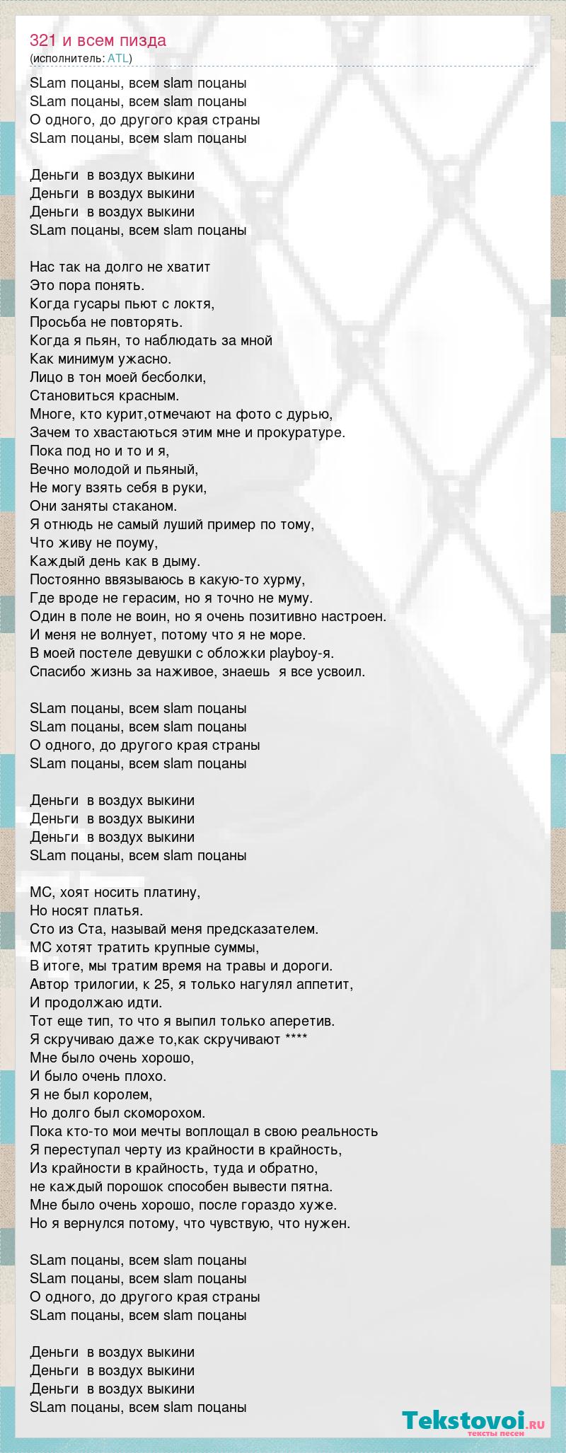 SLam поцаны, всем slam поцаны SLam поцаны, всем slam поцаны О одного, до другого края страны SLam поцаны, всем slam поцаны Деньги в воздух выкини Деньги в воздух выкини Деньги в воздух выкини SLam поцаны, всем slam поцаны Нас так на долго не хватит Это пора понять. Когда гусары пьют с локтя, Просьба не повторять. Когда я пьян, то наблюдать за мной Как минимум ужасно. Лицо в тон моей бесболки, Становиться красным. Многе, кто курит,отмечают на фото с дурью, Зачем то хвастаються этим мне и прокуратуре. Пока под но и то и я, Вечно молодой и пьяный, Не могу взять себя в руки, Они заняты стаканом. Я отнюдь не самый луший пример по тому, Что живу не поуму, Каждый день как в дыму. Постоянно ввязываюсь в какую-то хурму, Где вроде не герасим, но я точно не муму. Один в поле не воин, но я очень позитивно настроен. И меня не волнует, потому что я не море. В моей постеле девушки с обложки playboy-я. Спасибо жизнь за наживое, знаешь я все усвоил. SLam поцаны, всем slam поцаны SLam поцаны, всем slam поцаны О одного, до другого края страны SLam поцаны, всем slam поцаны Деньги в воздух выкини Деньги в воздух выкини Деньги в воздух выкини SLam поцаны, всем slam поцаны МС, хоят носить платину, Но носят платья. Сто из Ста, называй меня предсказателем. МС хотят тратить крупные суммы, В итоге, мы тратим время на травы и дороги. Автор трилогии, к 25, я только нагулял аппетит, И продолжаю идти. Тот еще тип, то что я выпил только аперетив. Я скручиваю даже то,как скручивают **** Мне было очень хорошо, И было очень плохо. Я не был королем, Но долго был скоморохом. Пока кто-то мои мечты воплощал в свою реальность Я переступал черту из крайности в крайность, Из крайности в крайность, туда и обратно, не каждый порошок способен вывести пятна. Мне было очень хорошо, после гораздо хуже. Но я вернулся потому, что чувствую, что нужен. SLam поцаны, всем slam поцаны SLam поцаны, всем slam поцаны О одного, до другого края страны SLam поцаны, всем slam поцаны Деньги в воздух выкини Деньги в воздух выкини Деньги в воздух выкини SLam поцаны, всем slam поцаны