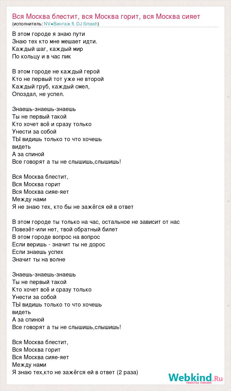 В этом городе я знаю пути Знаю тех кто мне мешает идти. Каждый шаг, каждый мир По кольцу и в час пик В этом городе не каждый герой Кто не первый тот уже не второй Каждый груб, каждый смел, Опоздал, не успел. Знаешь-знаешь-знаешь Ты не первый такой Кто хочет всё и сразу только Унести за собой ТЫ видишь только то что хочешь видеть А за спиной Все говорят а ты не слышишь,слышишь! Вся Москва блестит, Вся Москва горит Вся Москва сияе-яет Между нами Я не знаю тех, кто бы не зажёгся ей в ответ В этом городе ты только на час, остальное не зависит от нас Повезёт-или нет, твой обратный билет В этом городе вопрос на вопрос Если веришь - значит ты не дорос Если знаешь успех Значит ты на волне Знаешь-знаешь-знаешь Ты не первый такой Кто хочет всё и сразу только Унести за собой ТЫ видишь только то что хочешь видеть А за спиной Все говорят а ты не слышишь,слышишь! Вся Москва блестит, Вся Москва горит Вся Москва сияе-яет Между нами Я знаю тех,кто не зажёгся ей в ответ (2 раза)