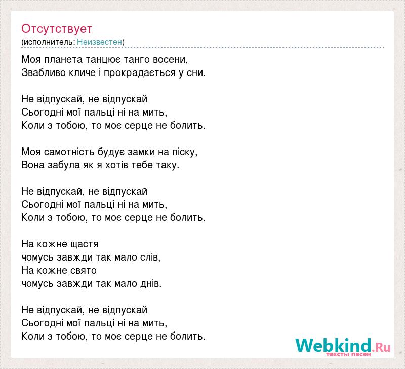 Моя планета танцює танго восени, Звабливо кличе і прокрадається у сни. Не відпускай, не відпускай Сьогодні мої пальці ні на мить, Коли з тобою, то моє серце не болить. Моя самотність будує замки на піску, Вона забула як я хотів тебе таку. Не відпускай, не відпускай Сьогодні мої пальці ні на мить, Коли з тобою, то моє серце не болить. На кожне щастя чомусь завжди так мало слів, На кожне свято чомусь завжди так мало днів. Не відпускай, не відпускай Сьогодні мої пальці ні на мить, Коли з тобою, то моє серце не болить.