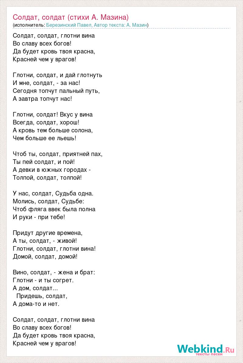 Солдат, солдат, глотни вина Во славу всех богов! Да будет кровь твоя красна, Красней чем у врагов! Глотни, солдат, и дай глотнуть И мне, солдат, - за нас! Сегодня топчут пальный путь, А завтра топчут нас! Глотни, солдат! Вкус у вина Всегда, солдат, хорош! А кровь тем больше солона, Чем больше ее льешь! Чтоб ты, солдат, приятней пах, Ты пей солдат, и пой! А девки в южных городах - Толпой, солдат, толпой! У нас, солдат, Судьба одна. Молись, солдат, Судьбе: Чтоб фляга ввек была полна И руки - при тебе! Придут другие времена, А ты, солдат, - живой! Глотни, солдат, глотни вина! Домой, солдат, домой! Вино, солдат, - жена и брат: Глотни - и ты согрет. А дом, солдат... Придешь, солдат, А дома-то и нет. Солдат, солдат, глотни вина Во славу всех богов! Да будет кровь твоя красна, Красней чем у врагов!