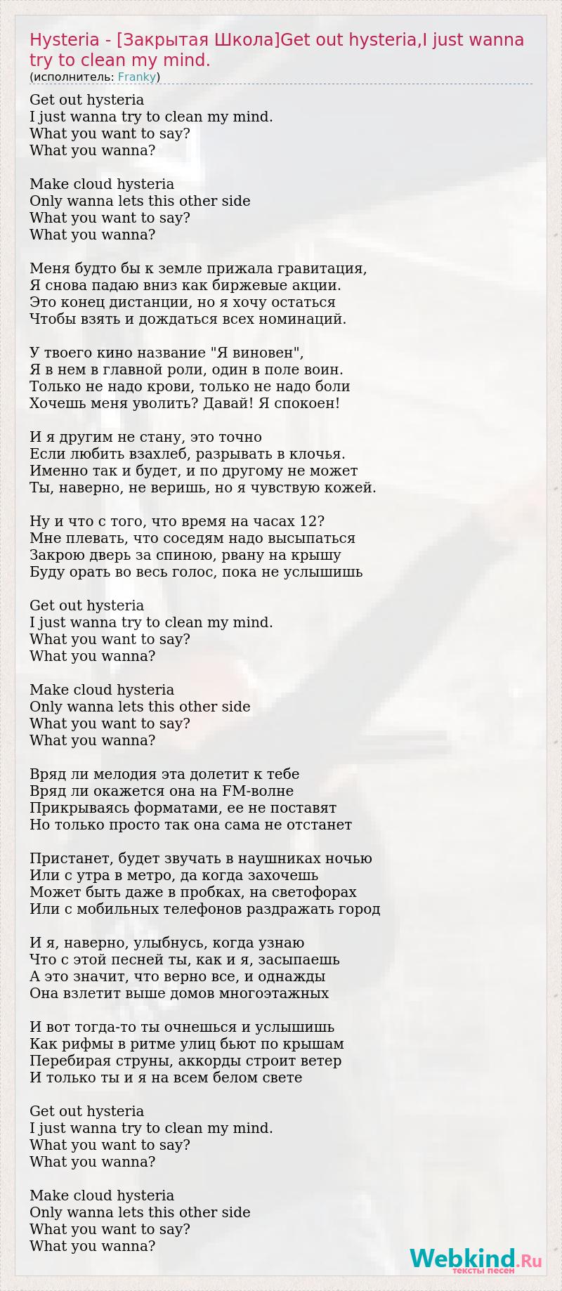 Get out hysteria I just wanna try to clean my mind. What you want to say? What you wanna? Make cloud hysteria Only wanna lets this other side What you want to say? What you wanna? Меня будто бы к земле прижала гравитация, Я снова падаю вниз как биржевые акции. Это конец дистанции, но я хочу остаться Чтобы взять и дождаться всех номинаций. У твоего кино название "Я виновен", Я в нем в главной роли, один в поле воин. Только не надо крови, только не надо боли Хочешь меня уволить? Давай! Я спокоен! И я другим не стану, это точно Если любить взахлеб, разрывать в клочья. Именно так и будет, и по другому не может Ты, наверно, не веришь, но я чувствую кожей. Ну и что с того, что время на часах 12? Мне плевать, что соседям надо высыпаться Закрою дверь за спиною, рвану на крышу Буду орать во весь голос, пока не услышишь Get out hysteria I just wanna try to clean my mind. What you want to say? What you wanna? Make cloud hysteria Only wanna lets this other side What you want to say? What you wanna? Вряд ли мелодия эта долетит к тебе Вряд ли окажется она на FM-волне Прикрываясь форматами, ее не поставят Но только просто так она сама не отстанет Пристанет, будет звучать в наушниках ночью Или с утра в метро, да когда захочешь Может быть даже в пробках, на светофорах Или с мобильных телефонов раздражать город И я, наверно, улыбнусь, когда узнаю Что с этой песней ты, как и я, засыпаешь А это значит, что верно все, и однажды Она взлетит выше домов многоэтажных И вот тогда-то ты очнешься и услышишь Как рифмы в ритме улиц бьют по крышам Перебирая струны, аккорды строит ветер И только ты и я на всем белом свете Get out hysteria I just wanna try to clean my mind. What you want to say? What you wanna? Make cloud hysteria Only wanna lets this other side What you want to say? What you wanna?