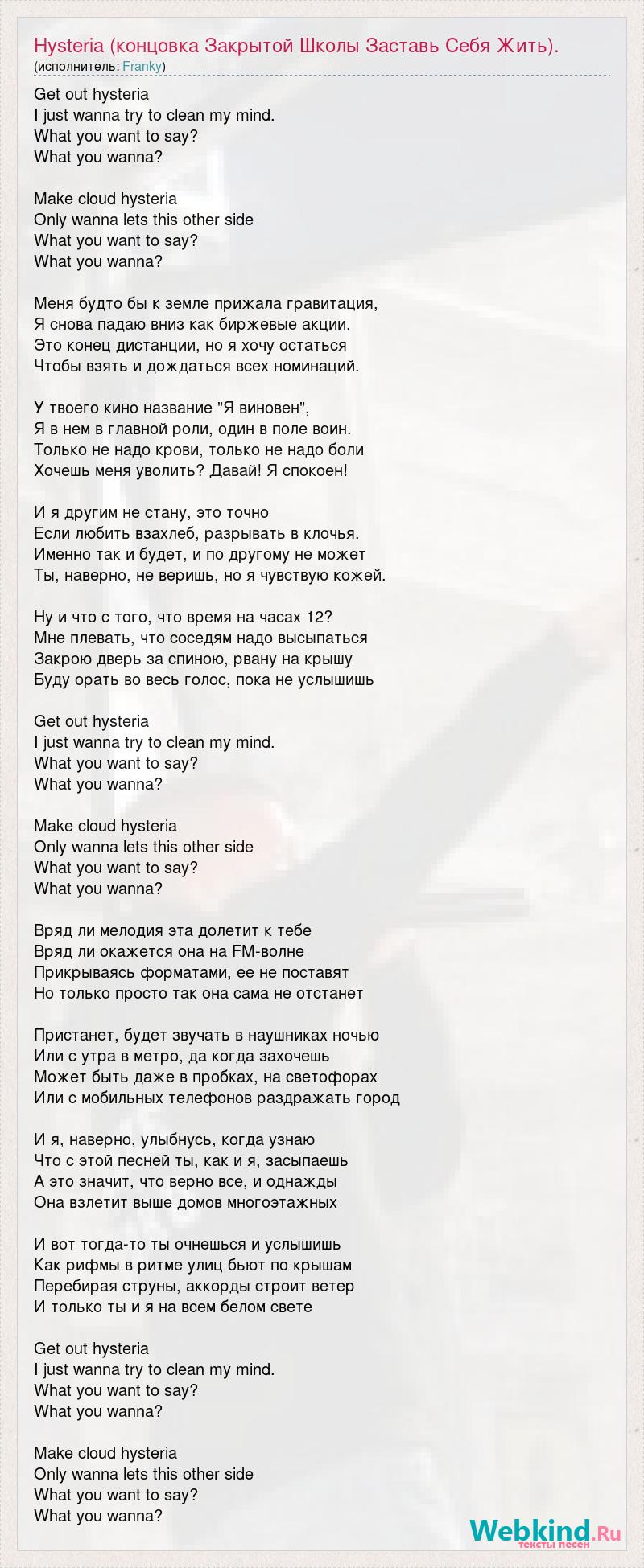 Get out hysteria I just wanna try to clean my mind. What you want to say? What you wanna? Make cloud hysteria Only wanna lets this other side What you want to say? What you wanna? Меня будто бы к земле прижала гравитация, Я снова падаю вниз как биржевые акции. Это конец дистанции, но я хочу остаться Чтобы взять и дождаться всех номинаций. У твоего кино название "Я виновен", Я в нем в главной роли, один в поле воин. Только не надо крови, только не надо боли Хочешь меня уволить? Давай! Я спокоен! И я другим не стану, это точно Если любить взахлеб, разрывать в клочья. Именно так и будет, и по другому не может Ты, наверно, не веришь, но я чувствую кожей. Ну и что с того, что время на часах 12? Мне плевать, что соседям надо высыпаться Закрою дверь за спиною, рвану на крышу Буду орать во весь голос, пока не услышишь Get out hysteria I just wanna try to clean my mind. What you want to say? What you wanna? Make cloud hysteria Only wanna lets this other side What you want to say? What you wanna? Вряд ли мелодия эта долетит к тебе Вряд ли окажется она на FM-волне Прикрываясь форматами, ее не поставят Но только просто так она сама не отстанет Пристанет, будет звучать в наушниках ночью Или с утра в метро, да когда захочешь Может быть даже в пробках, на светофорах Или с мобильных телефонов раздражать город И я, наверно, улыбнусь, когда узнаю Что с этой песней ты, как и я, засыпаешь А это значит, что верно все, и однажды Она взлетит выше домов многоэтажных И вот тогда-то ты очнешься и услышишь Как рифмы в ритме улиц бьют по крышам Перебирая струны, аккорды строит ветер И только ты и я на всем белом свете Get out hysteria I just wanna try to clean my mind. What you want to say? What you wanna? Make cloud hysteria Only wanna lets this other side What you want to say? What you wanna?