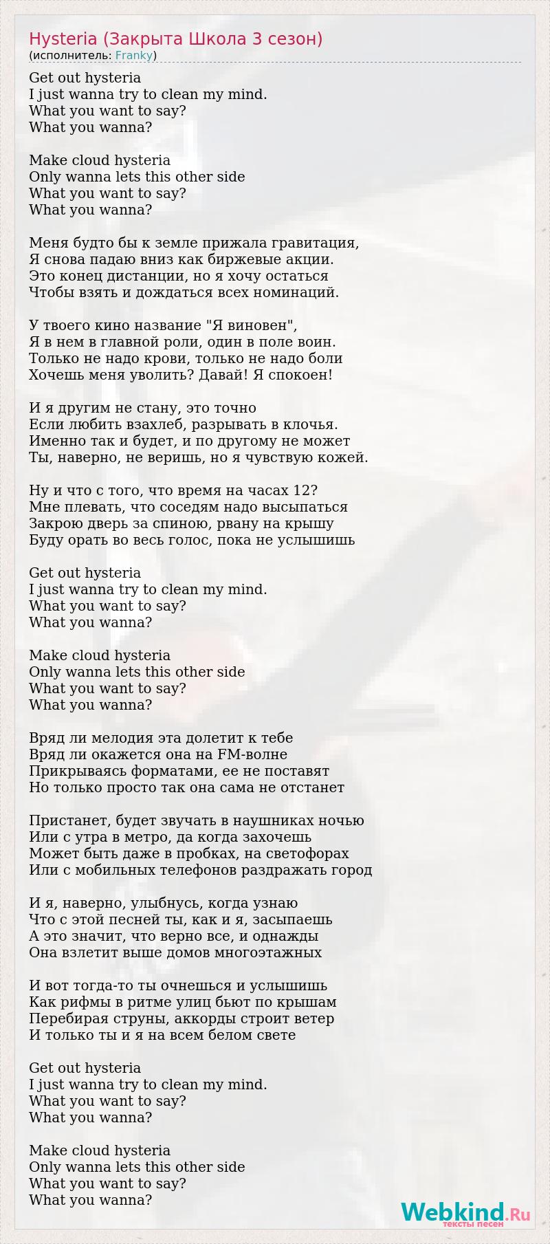 Get out hysteria I just wanna try to clean my mind. What you want to say? What you wanna? Make cloud hysteria Only wanna lets this other side What you want to say? What you wanna? Меня будто бы к земле прижала гравитация, Я снова падаю вниз как биржевые акции. Это конец дистанции, но я хочу остаться Чтобы взять и дождаться всех номинаций. У твоего кино название "Я виновен", Я в нем в главной роли, один в поле воин. Только не надо крови, только не надо боли Хочешь меня уволить? Давай! Я спокоен! И я другим не стану, это точно Если любить взахлеб, разрывать в клочья. Именно так и будет, и по другому не может Ты, наверно, не веришь, но я чувствую кожей. Ну и что с того, что время на часах 12? Мне плевать, что соседям надо высыпаться Закрою дверь за спиною, рвану на крышу Буду орать во весь голос, пока не услышишь Get out hysteria I just wanna try to clean my mind. What you want to say? What you wanna? Make cloud hysteria Only wanna lets this other side What you want to say? What you wanna? Вряд ли мелодия эта долетит к тебе Вряд ли окажется она на FM-волне Прикрываясь форматами, ее не поставят Но только просто так она сама не отстанет Пристанет, будет звучать в наушниках ночью Или с утра в метро, да когда захочешь Может быть даже в пробках, на светофорах Или с мобильных телефонов раздражать город И я, наверно, улыбнусь, когда узнаю Что с этой песней ты, как и я, засыпаешь А это значит, что верно все, и однажды Она взлетит выше домов многоэтажных И вот тогда-то ты очнешься и услышишь Как рифмы в ритме улиц бьют по крышам Перебирая струны, аккорды строит ветер И только ты и я на всем белом свете Get out hysteria I just wanna try to clean my mind. What you want to say? What you wanna? Make cloud hysteria Only wanna lets this other side What you want to say? What you wanna?