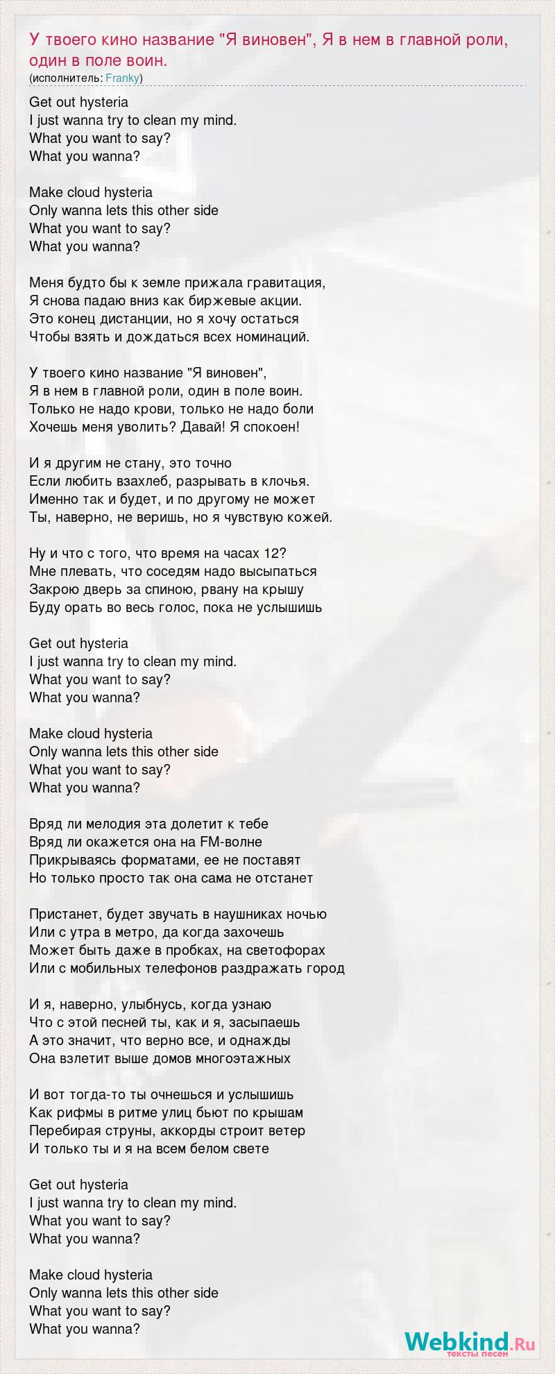 Get out hysteria I just wanna try to clean my mind. What you want to say? What you wanna? Make cloud hysteria Only wanna lets this other side What you want to say? What you wanna? Меня будто бы к земле прижала гравитация, Я снова падаю вниз как биржевые акции. Это конец дистанции, но я хочу остаться Чтобы взять и дождаться всех номинаций. У твоего кино название "Я виновен", Я в нем в главной роли, один в поле воин. Только не надо крови, только не надо боли Хочешь меня уволить? Давай! Я спокоен! И я другим не стану, это точно Если любить взахлеб, разрывать в клочья. Именно так и будет, и по другому не может Ты, наверно, не веришь, но я чувствую кожей. Ну и что с того, что время на часах 12? Мне плевать, что соседям надо высыпаться Закрою дверь за спиною, рвану на крышу Буду орать во весь голос, пока не услышишь Get out hysteria I just wanna try to clean my mind. What you want to say? What you wanna? Make cloud hysteria Only wanna lets this other side What you want to say? What you wanna? Вряд ли мелодия эта долетит к тебе Вряд ли окажется она на FM-волне Прикрываясь форматами, ее не поставят Но только просто так она сама не отстанет Пристанет, будет звучать в наушниках ночью Или с утра в метро, да когда захочешь Может быть даже в пробках, на светофорах Или с мобильных телефонов раздражать город И я, наверно, улыбнусь, когда узнаю Что с этой песней ты, как и я, засыпаешь А это значит, что верно все, и однажды Она взлетит выше домов многоэтажных И вот тогда-то ты очнешься и услышишь Как рифмы в ритме улиц бьют по крышам Перебирая струны, аккорды строит ветер И только ты и я на всем белом свете Get out hysteria I just wanna try to clean my mind. What you want to say? What you wanna? Make cloud hysteria Only wanna lets this other side What you want to say? What you wanna?