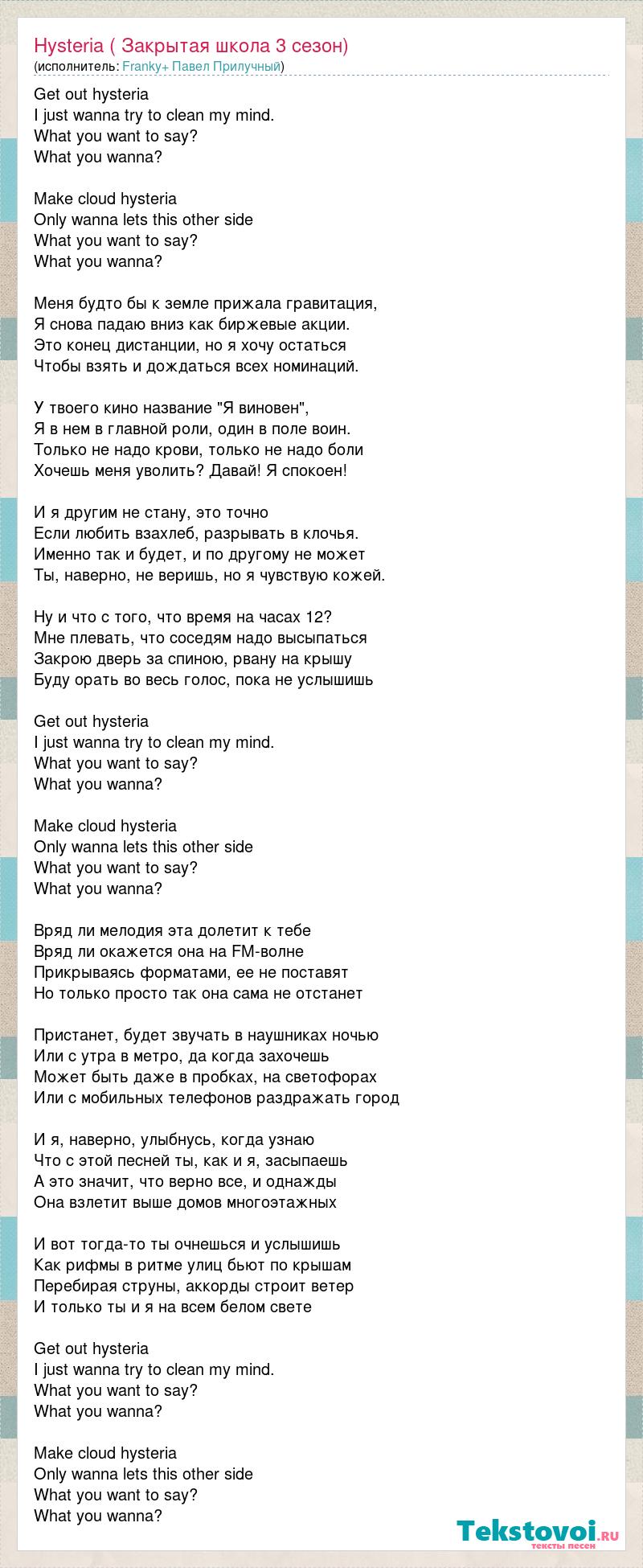 Get out hysteria I just wanna try to clean my mind. What you want to say? What you wanna? Make cloud hysteria Only wanna lets this other side What you want to say? What you wanna? Меня будто бы к земле прижала гравитация, Я снова падаю вниз как биржевые акции. Это конец дистанции, но я хочу остаться Чтобы взять и дождаться всех номинаций. У твоего кино название "Я виновен", Я в нем в главной роли, один в поле воин. Только не надо крови, только не надо боли Хочешь меня уволить? Давай! Я спокоен! И я другим не стану, это точно Если любить взахлеб, разрывать в клочья. Именно так и будет, и по другому не может Ты, наверно, не веришь, но я чувствую кожей. Ну и что с того, что время на часах 12? Мне плевать, что соседям надо высыпаться Закрою дверь за спиною, рвану на крышу Буду орать во весь голос, пока не услышишь Get out hysteria I just wanna try to clean my mind. What you want to say? What you wanna? Make cloud hysteria Only wanna lets this other side What you want to say? What you wanna? Вряд ли мелодия эта долетит к тебе Вряд ли окажется она на FM-волне Прикрываясь форматами, ее не поставят Но только просто так она сама не отстанет Пристанет, будет звучать в наушниках ночью Или с утра в метро, да когда захочешь Может быть даже в пробках, на светофорах Или с мобильных телефонов раздражать город И я, наверно, улыбнусь, когда узнаю Что с этой песней ты, как и я, засыпаешь А это значит, что верно все, и однажды Она взлетит выше домов многоэтажных И вот тогда-то ты очнешься и услышишь Как рифмы в ритме улиц бьют по крышам Перебирая струны, аккорды строит ветер И только ты и я на всем белом свете Get out hysteria I just wanna try to clean my mind. What you want to say? What you wanna? Make cloud hysteria Only wanna lets this other side What you want to say? What you wanna?