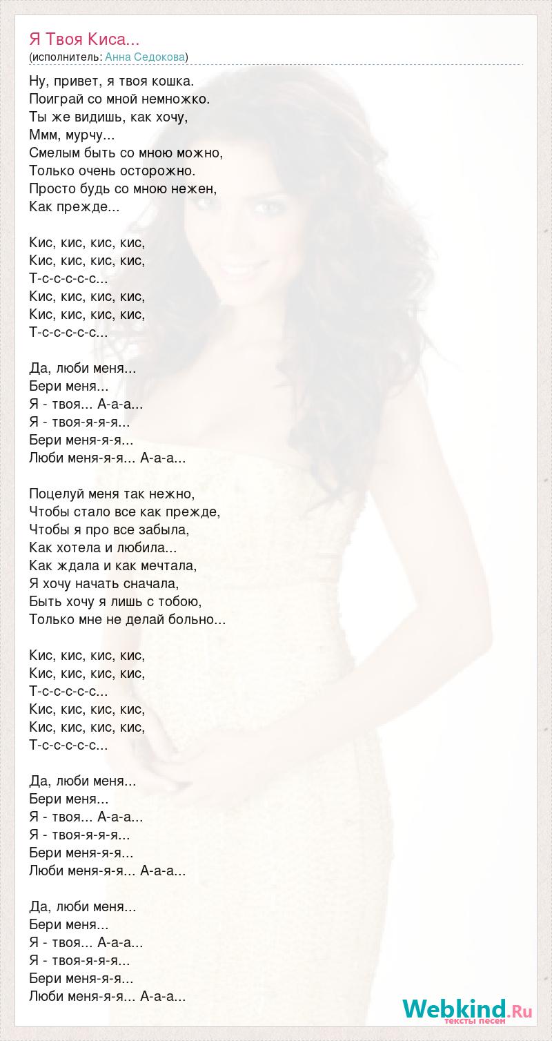 Ну, привет, я твоя кошка. Поиграй со мной немножко. Ты же видишь, как хочу, Ммм, мурчу... Смелым быть со мною можно, Только очень осторожно. Просто будь со мною нежен, Как прежде... Кис, кис, кис, кис, Кис, кис, кис, кис, Т-с-с-с-с-с... Кис, кис, кис, кис, Кис, кис, кис, кис, Т-с-с-с-с-с... Да, люби меня... Бери меня... Я - твоя... А-а-а... Я - твоя-я-я-я... Бери меня-я-я... Люби меня-я-я... А-а-а... Поцелуй меня так нежно, Чтобы стало все как прежде, Чтобы я про все забыла, Как хотела и любила... Как ждала и как мечтала, Я хочу начать сначала, Быть хочу я лишь с тобою, Только мне не делай больно... Кис, кис, кис, кис, Кис, кис, кис, кис, Т-с-с-с-с-с... Кис, кис, кис, кис, Кис, кис, кис, кис, Т-с-с-с-с-с... Да, люби меня... Бери меня... Я - твоя... А-а-а... Я - твоя-я-я-я... Бери меня-я-я... Люби меня-я-я... А-а-а... Да, люби меня... Бери меня... Я - твоя... А-а-а... Я - твоя-я-я-я... Бери меня-я-я... Люби меня-я-я... А-а-а...