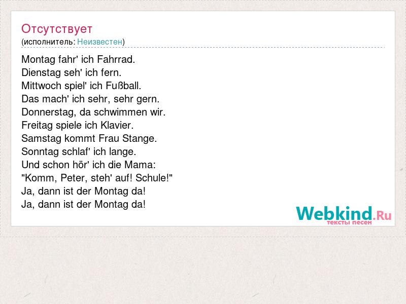 Montag fahr' ich Fahrrad. Dienstag seh' ich fern. Mittwoch spiel' ich Fußball. Das mach' ich sehr, sehr gern. Donnerstag, da schwimmen wir. Freitag spiele ich Klavier. Samstag kommt Frau Stange. Sonntag schlaf' ich lange. Und schon hör' ich die Mama: "Komm, Peter, steh' auf! Schule!" Ja, dann ist der Montag da! Ja, dann ist der Montag da!