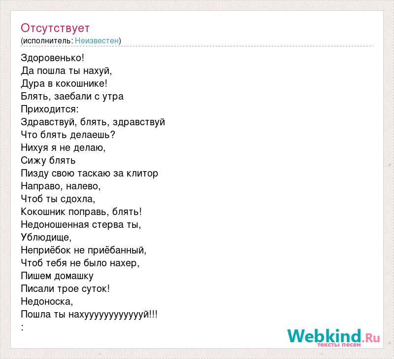 Здоровенько! Да пошла ты нахуй, Дура в кокошнике! Блять, заебали с утра Приходится: Здравствуй, блять, здравствуй Что блять делаешь? Нихуя я не делаю, Сижу блять Пизду свою таскаю за клитор Направо, налево, Чтоб ты сдохла, Кокошник поправь, блять! Недоношенная стерва ты, Ублюдище, Неприёбок не приёбанный, Чтоб тебя не было нахер, Пишем домашку Писали трое суток! Недоноска, Пошла ты нахууууууууууууй!!! :