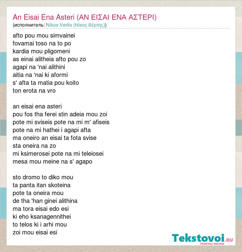 afto pou mou simvainei fovamai toso na to po kardia mou pligomeni as einai alitheia afto pou zo agapi na 'nai alithini aitia na 'nai ki aformi s' afta ta matia pou koito ton erota na vro an eisai ena asteri pou fos tha ferei stin adeia mou zoi pote mi sviseis pote na mi m' afiseis pote na mi hathei i agapi afta ma oneiro an eisai ta fota svise sta oneira na zo mi ksimerosei pote na mi teleiosei mesa mou meine na s' agapo sto dromo to diko mou ta panta itan skoteina pote ta oneira mou de tha 'han ginei alithina ma tora eisai edo esi ki eho ksanagennithei to telos ki i arhi mou zoi mou eisai esi