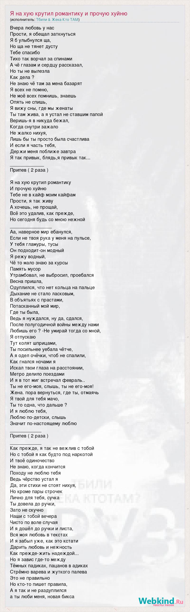 Вчера любовь у нас Прости, я обещал заткнуться Я б улыбнулся ща, Но ща не тянет дусту Тебе спасибо Тихо так ворчал за спинами А чё глазам и сердцу рассказал, Но ты не вылезла Как дела ? Не знаю чё там за мена базарят Я всех не помню, Не моё всех помнишь, знаешь Опять не спишь, Я вижу сны, где мы женаты Ты там жива, а я устал не ставшим папой Веришь-я в никуда бежал, Когда снутри зажало Не жалко нихуя, Лишь бы ты просто была счастлива И если я часть тебя, Держи меня поближе завтра Я так привык, блядь,я привык так... _____________ Припев ( 2 раза ) Я на хую крутил романтику И прочую хуйню Тебе не в кайф моим кайфам Прости, я так живу А хочешь, не прощай, Всё это удалив, как прежде, Но сегодня будь со мною нежной ________________ Аа, наверное мир ебанулся, Если не твоя рука у меня на пульсе, У тебя гламуры, тусы Он подходит-он модный Я режу водный, Чё то мало знаю за курсы Память мусор Утрамбовал, не выбросил, проебался Весна пришла, Одуплился, что нет кольца на пальце Дыхание не стало ласковым, В объятьях с прастами, Потасканный мой мир, Где ты была, Ведь я нуждался, ну да, сдался, После полугодичной войны между нами Любишь его ? -Не умирай тогда со мной, Я отпускаю Тут колят шприцами, Ты посильнее уебала чётче, А я одел очёчки, чтоб не спалили, Как гнался ночами я Искал твои глаза на расстоянии, Метро делило поездами И я в тот миг встречал февраль.. Ты не его-моя, слышь, ты не его-моя! Жена. пора вернуться, где ты, отмаячь Я твой для тебя мачо, Ты то одна, что дальше ? И я люблю тебя, Люблю по-детски, слышь Значит по-настоящему люблю ____________ Припев ( 2 раза ) ____________ Как прежде, я так не вежлив с тобой Но с тобой я как будто под наркотой И твоё одиночество Не знаю, когда кончится Походу не люблю тебя Ведь чёрство устал я Да, эти стихи не стоят нихуя, Но кроме пары строчек Лично для тебя, сучка Ты довела до ручки, Зато не скучно Наши с тобой вечера Чисто по воле случая И я дошёл до ручки и листа, Вся моя любовь в текстах И я забыл уже, как это кстати Дарить любовь и нежность Как прежде-жить надеждой... Но я завис где-то между Тёмных падиках, пацанов в адиках Стрёмно варева и жуткого палева Это не правильно Но кто-то пишет правила, А я так и не раздуплился а ты люби меня, новая бикса