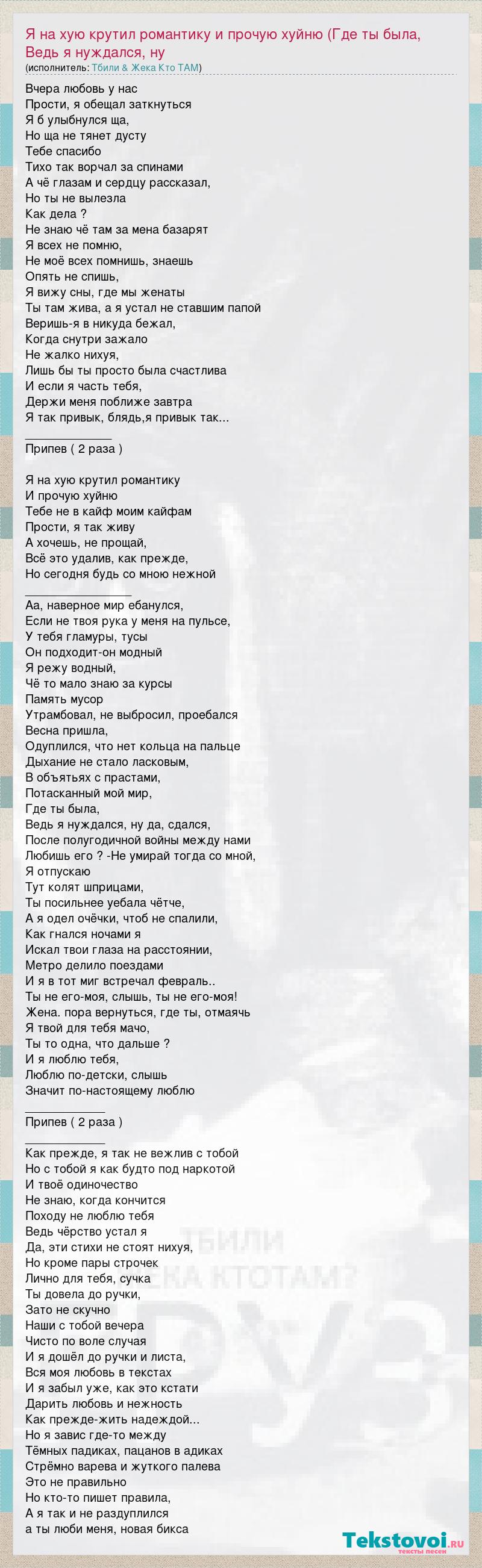Главная→Исполнители→Тбили & Жека Кто Там→Я на хую крутил романтику и прочую хуйню (Где ты была, Ведь я нуждался, н
