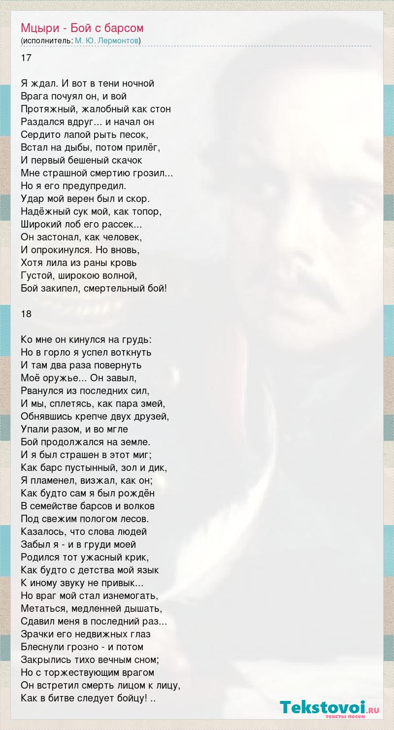 17 Я ждал. И вот в тени ночной Врага почуял он, и вой Протяжный, жалобный как стон Раздался вдруг... и начал он Сердито лапой рыть песок, Встал на дыбы, потом прилёг, И первый бешеный скачок Мне страшной смертию грозил... Но я его предупредил. Удар мой верен был и скор. Надёжный сук мой, как топор, Широкий лоб его рассек... Он застонал, как человек, И опрокинулся. Но вновь, Хотя лила из раны кровь Густой, широкою волной, Бой закипел, смертельный бой! 18 Ко мне он кинулся на грудь: Но в горло я успел воткнуть И там два раза повернуть Моё оружье... Он завыл, Рванулся из последних сил, И мы, сплетясь, как пара змей, Обнявшись крепче двух друзей, Упали разом, и во мгле Бой продолжался на земле. И я был страшен в этот миг; Как барс пустынный, зол и дик, Я пламенел, визжал, как он; Как будто сам я был рождён В семействе барсов и волков Под свежим пологом лесов. Казалось, что слова людей Забыл я - и в груди моей Родился тот ужасный крик, Как будто с детства мой язык К иному звуку не привык... Но враг мой стал изнемогать, Метаться, медленней дышать, Сдавил меня в последний раз... Зрачки его недвижных глаз Блеснули грозно - и потом Закрылись тихо вечным сном; Но с торжествующим врагом Он встретил смерть лицом к лицу, Как в битве следует бойцу! ..