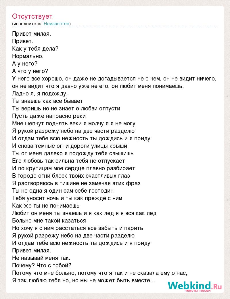 Привет милая. Привет. Как у тебя дела? Нормально. А у него? А что у него? У него все хорошо, он даже не догадывается не о чем, он не видит ничего, он не видит что я давно уже не его, он любит меня понимаешь. Ладно я, я подожду. Ты знаешь как все бывает Ты веришь но не знает о любви отпусти Пусть даже напрасно реки Мне шепчут поднять веки я молчу я я не могу Я рукой разрежу небо на две части разделю И отдам тебе всю нежность ты дождись и я приду И снова темные огни дороги улицы крыши Ты от меня далеко я подожду тебя слышишь Его любовь так сильна тебя не отпускает И по крупицам мое сердце плавно разбирает В городе огни блеск твоих счастливых глаз Я растворяюсь в тишине не замечая этих фраз Ты не одна я один сам себе господин Тебя уносит ночь и ты как прежде с ним Как же ты не понимаешь Любит он меня ты знаешь и я как лед я я вся как лед Больно мне такой казаться Но хочу я с ним расстаться все забыть и парить Я рукой разрежу небо на две части разделю И отдам тебе всю нежность ты дождись и я приду Привет милая. Не называй меня так. Почему? Что с тобой? Потому что мне больно, потому что я так и не сказала ему о нас, Я так люблю тебя но, но мы не может быть вместе...