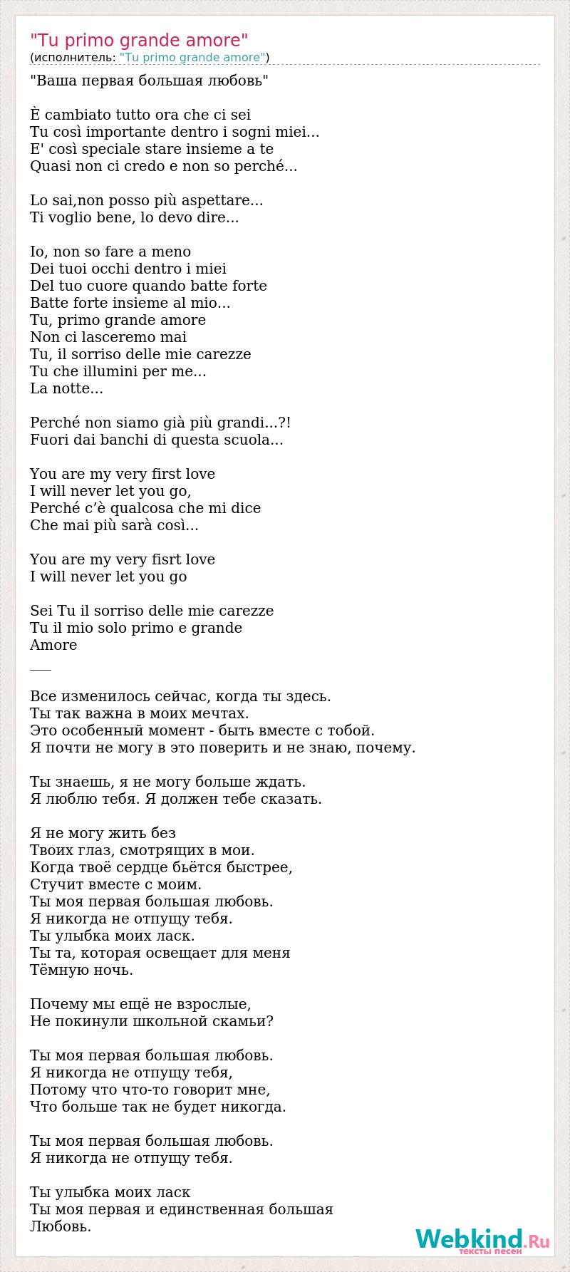 "Ваша первая большая любовь" È cambiato tutto ora che ci sei Tu così importante dentro i sogni miei... E' così speciale stare insieme a te Quasi non ci credo e non so perché... Lo sai,non posso più aspettare... Ti voglio bene, lo devo dire... Io, non so fare a meno Dei tuoi occhi dentro i miei Del tuo cuore quando batte forte Batte forte insieme al mio... Tu, primo grande amore Non ci lasceremo mai Tu, il sorriso delle mie carezze Tu che illumini per me... La notte... Perché non siamo già più grandi...?! Fuori dai banchi di questa scuola... You are my very first love I will never let you go, Perché c’è qualcosa che mi dice Che mai più sarà così... You are my very fisrt love I will never let you go Sei Tu il sorriso delle mie carezze Tu il mio solo primo e grande Amore ___ Все изменилось сейчас, когда ты здесь. Ты так важна в моих мечтах. Это особенный момент - быть вместе с тобой. Я почти не могу в это поверить и не знаю, почему. Ты знаешь, я не могу больше ждать. Я люблю тебя. Я должен тебе сказать. Я не могу жить без Твоих глаз, смотрящих в мои. Когда твоё сердце бьётся быстрее, Стучит вместе с моим. Ты моя первая большая любовь. Я никогда не отпущу тебя. Ты улыбка моих ласк. Ты та, которая освещает для меня Тёмную ночь. Почему мы ещё не взрослые, Не покинули школьной скамьи? Ты моя первая большая любовь. Я никогда не отпущу тебя, Потому что что-то говорит мне, Что больше так не будет никогда. Ты моя первая большая любовь. Я никогда не отпущу тебя. Ты улыбка моих ласк Ты моя первая и единственная большая Любовь.