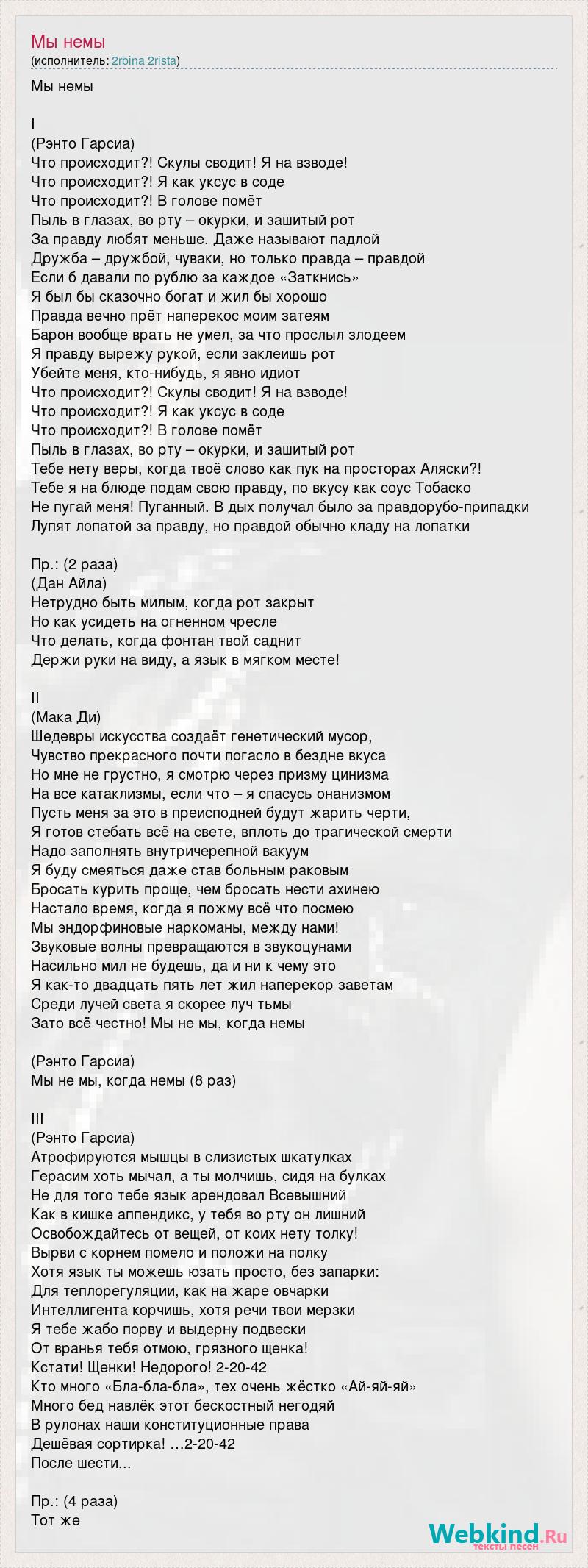 Мы немы I (Рэнто Гарсиа) Что происходит?! Скулы сводит! Я на взводе! Что происходит?! Я как уксус в соде Что происходит?! В голове помёт Пыль в глазах, во рту – окурки, и зашитый рот За правду любят меньше. Даже называют падлой Дружба – дружбой, чуваки, но только правда – правдой Если б давали по рублю за каждое «Заткнись» Я был бы сказочно богат и жил бы хорошо Правда вечно прёт наперекос моим затеям Барон вообще врать не умел, за что прослыл злодеем Я правду вырежу рукой, если заклеишь рот Убейте меня, кто-нибудь, я явно идиот Что происходит?! Скулы сводит! Я на взводе! Что происходит?! Я как уксус в соде Что происходит?! В голове помёт Пыль в глазах, во рту – окурки, и зашитый рот Тебе нету веры, когда твоё слово как пук на просторах Аляски?! Тебе я на блюде подам свою правду, по вкусу как соус Тобаско Не пугай меня! Пуганный. В дых получал было за правдорубо-припадки Лупят лопатой за правду, но правдой обычно кладу на лопатки Пр.: (2 раза) (Дан Айла) Нетрудно быть милым, когда рот закрыт Но как усидеть на огненном чресле Что делать, когда фонтан твой саднит Держи руки на виду, а язык в мягком месте! II (Мака Ди) Шедевры искусства создаёт генетический мусор, Чувство прекрасного почти погасло в бездне вкуса Но мне не грустно, я смотрю через призму цинизма На все катаклизмы, если что – я спасусь онанизмом Пусть меня за это в преисподней будут жарить черти, Я готов стебать всё на свете, вплоть до трагической смерти Надо заполнять внутричерепной вакуум Я буду смеяться даже став больным раковым Бросать курить проще, чем бросать нести ахинею Настало время, когда я пожму всё что посмею Мы эндорфиновые наркоманы, между нами! Звуковые волны превращаются в звукоцунами Насильно мил не будешь, да и ни к чему это Я как-то двадцать пять лет жил наперекор заветам Среди лучей света я скорее луч тьмы Зато всё честно! Мы не мы, когда немы (Рэнто Гарсиа) Мы не мы, когда немы (8 раз) III (Рэнто Гарсиа) Атрофируются мышцы в слизистых шкатулках Герасим хоть мычал, а ты молчишь, сидя на булках Не для того тебе язык арендовал Всевышний Как в кишке аппендикс, у тебя во рту он лишний Освобождайтесь от вещей, от коих нету толку! Вырви с корнем помело и положи на полку Хотя язык ты можешь юзать просто, без запарки: Для теплорегуляции, как на жаре овчарки Интеллигента корчишь, хотя речи твои мерзки Я тебе жабо порву и выдерну подвески От вранья тебя отмою, грязного щенка! Кстати! Щенки! Недорого! 2-20-42 Кто много «Бла-бла-бла», тех очень жёстко «Ай-яй-яй» Много бед навлёк этот бескостный негодяй В рулонах наши конституционные права Дешёвая сортирка! …2-20-42 После шести... Пр.: (4 раза) Тот же