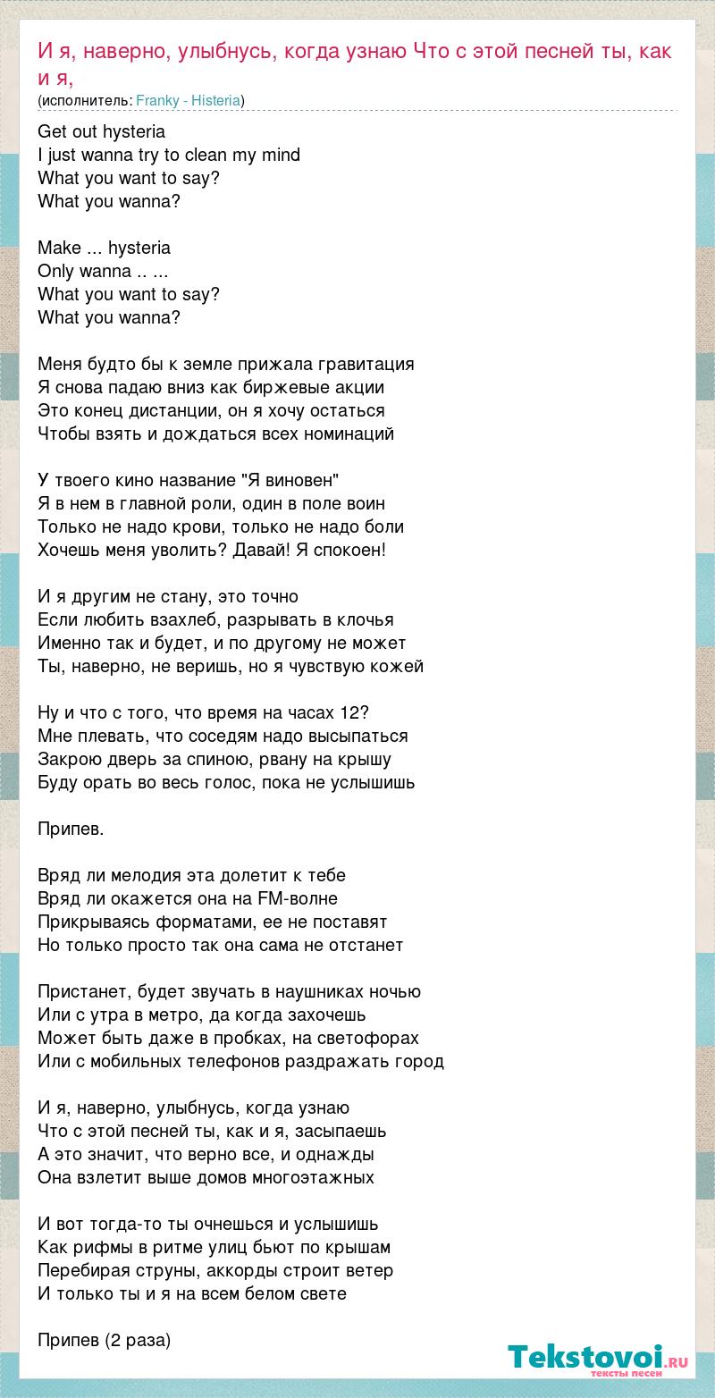 Главная→Исполнители→Franky - Histeria→И я, наверно, улыбнусь, когда узнаю Что с этой песней ты, как и я,