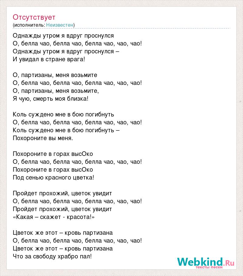 Однажды утром я вдруг проснулся О, белла чао, белла чао, белла чао, чао, чао! Однажды утром я вдруг проснулся – И увидал в стране врага! О, партизаны, меня возьмите О, белла чао, белла чао, белла чао, чао, чао! О, партизаны, меня возьмите, Я чую, смерть моя близка! Коль суждено мне в бою погибнуть О, белла чао, белла чао, белла чао, чао, чао! Коль суждено мне в бою погибнуть – Похороните вы меня. Похороните в горах высОко О, белла чао, белла чао, белла чао, чао, чао! Похороните в горах высОко Под сенью красного цветка! Пройдет прохожий, цветок увидит О, белла чао, белла чао, белла чао, чао, чао! Пройдет прохожий, цветок увидит «Какая – скажет - красота!» Цветок же этот – кровь партизана О, белла чао, белла чао, белла чао, чао, чао! Цветок же этот – кровь партизана Что за свободу храбро пал!
