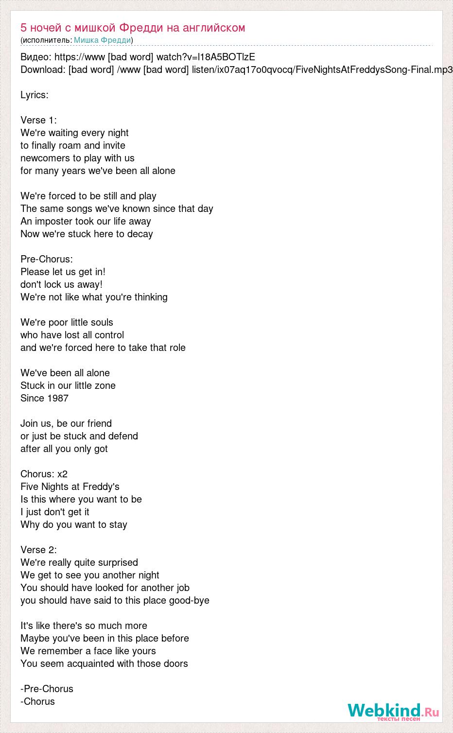 Видео: https://www [bad word] watch?v=l18A5BOTlzE Download: [bad word] /www [bad word] listen/ix07aq17o0qvocq/FiveNightsAtFreddysSong-Final.mp3 Lyrics: Verse 1: We're waiting every night to finally roam and invite newcomers to play with us for many years we've been all alone We're forced to be still and play The same songs we've known since that day An imposter took our life away Now we're stuck here to decay Pre-Chorus: Please let us get in! don't lock us away! We're not like what you're thinking We're poor little souls who have lost all control and we're forced here to take that role We've been all alone Stuck in our little zone Since 1987 Join us, be our friend or just be stuck and defend after all you only got Chorus: x2 Five Nights at Freddy's Is this where you want to be I just don't get it Why do you want to stay Verse 2: We're really quite surprised We get to see you another night You should have looked for another job you should have said to this place good-bye It's like there's so much more Maybe you've been in this place before We remember a face like yours You seem acquainted with those doors -Pre-Chorus -Chorus